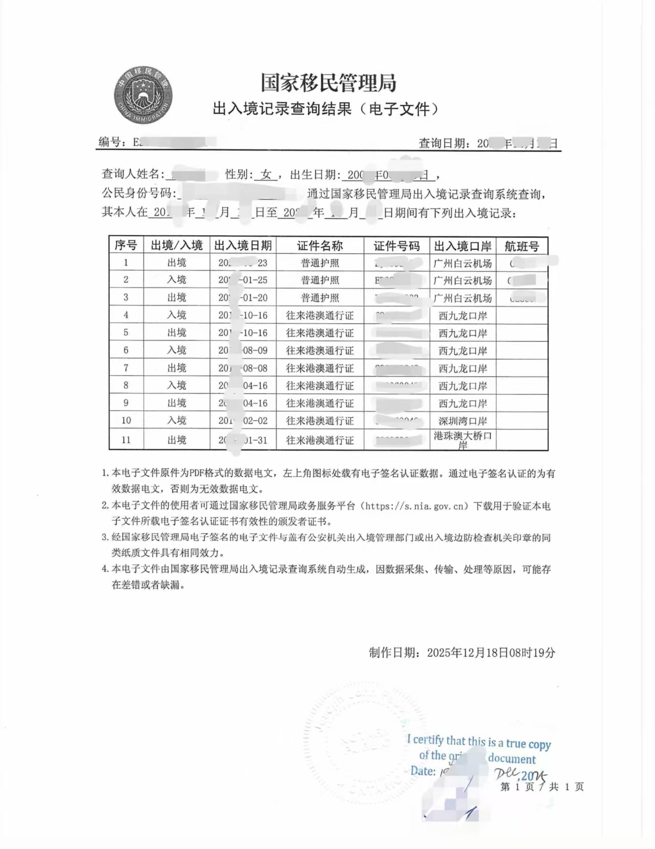 张女士(化名)长期居住在加拿大,近期因办理加拿大永久居民身份更新及相关合规审查,被要求补充提供其过往完整的出入境记录证明文件。由于其早年多次往返中国大陆、香港及其他地区,加拿大相关机构明确要求提交由中国官方出具的出入境记录查询结果,并须附英文翻译及加拿大本地认可的翻译公证文件。