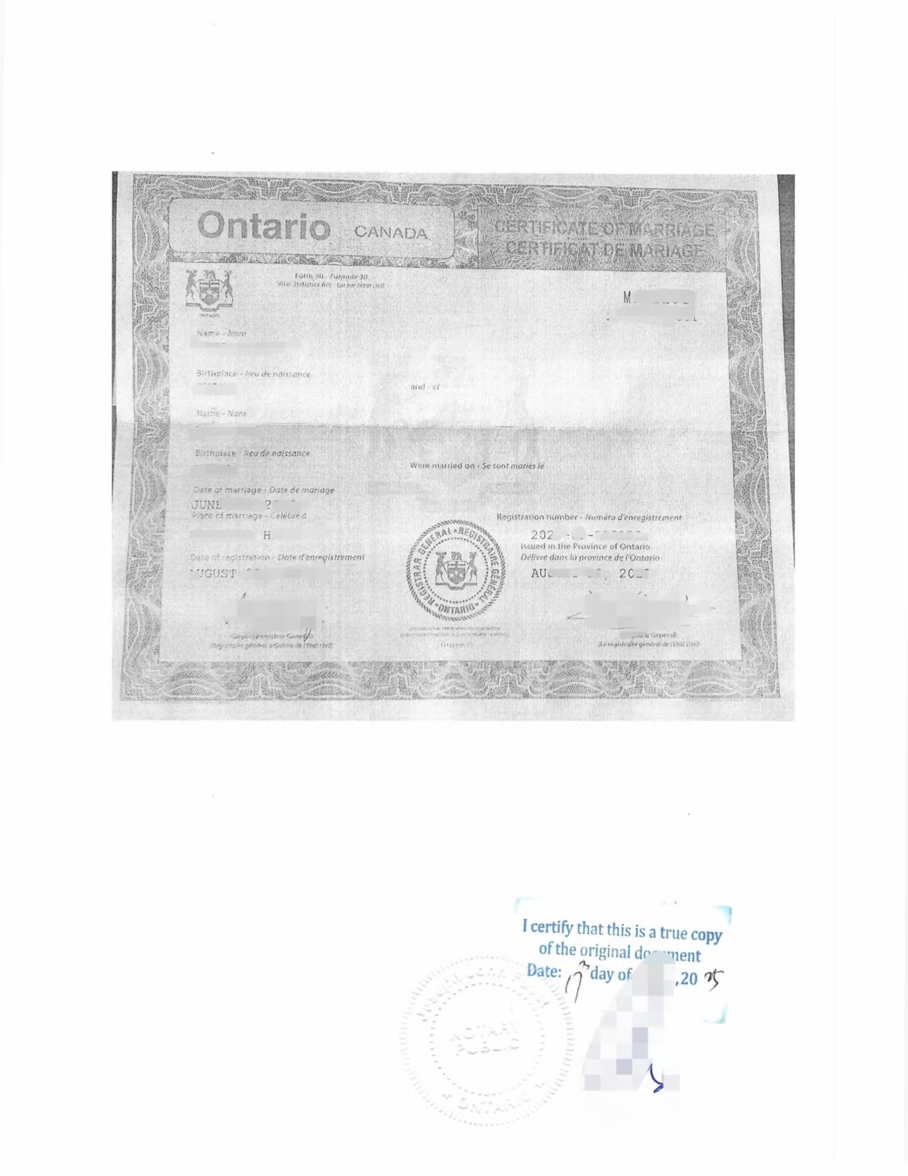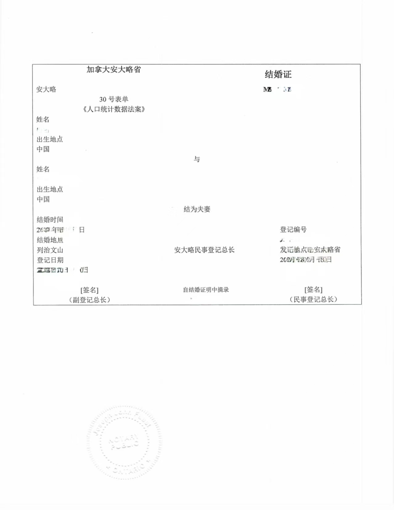 周先生夫妇提供的加拿大结婚证载明了双方姓名、出生地、婚姻关系、结婚日期、登记地点及登记编号,并由安大略省民事登记官正式签发,属于加拿大法定的婚姻证明文件。该证书原件为英文格式,若直接提交至中国相关机构,往往因语言及认证形式不符而无法使用。