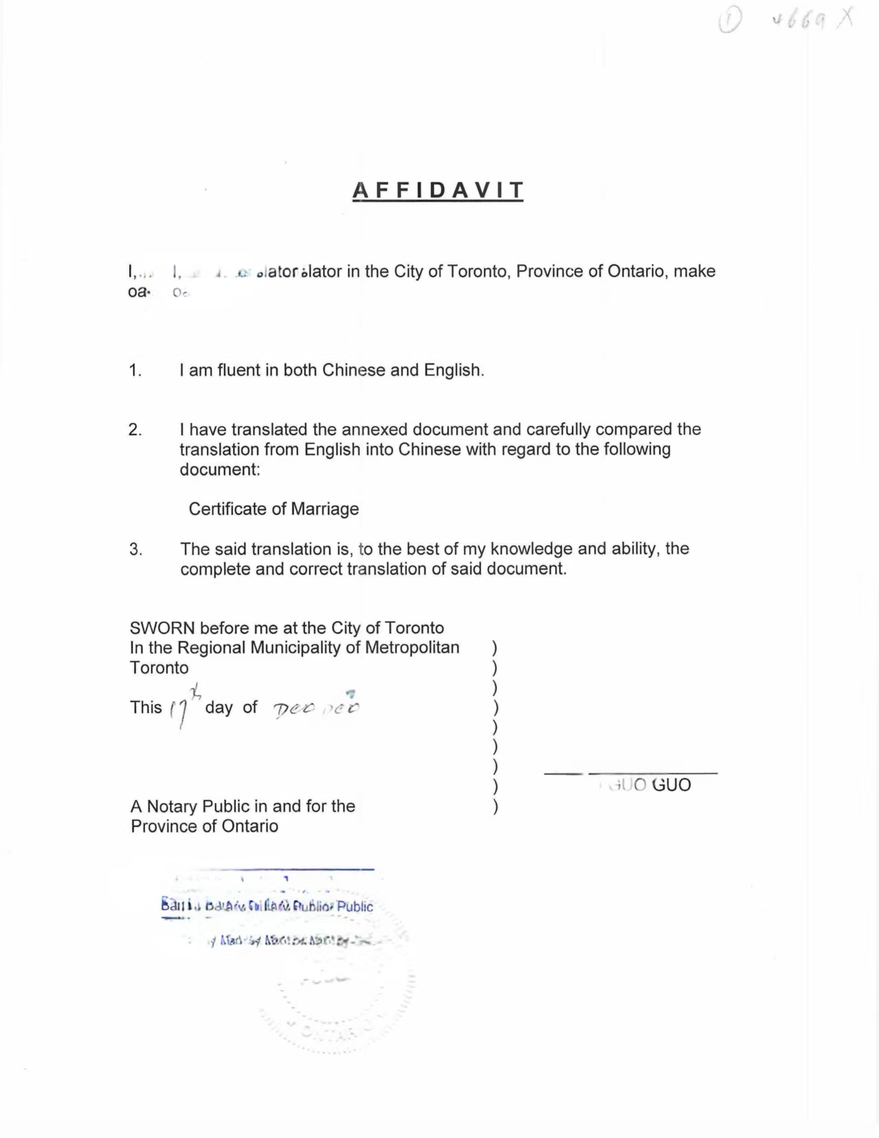 在本案中,首先对结婚证进行了中英文翻译,并由加拿大执业译员出具翻译宣誓书,确认译文内容与原英文结婚证完全一致、真实准确。翻译内容涵盖双方身份信息、婚姻关系描述、结婚时间及登记机关等核心信息,满足国内部门对“境外结婚证明中文件”的审查要求。
