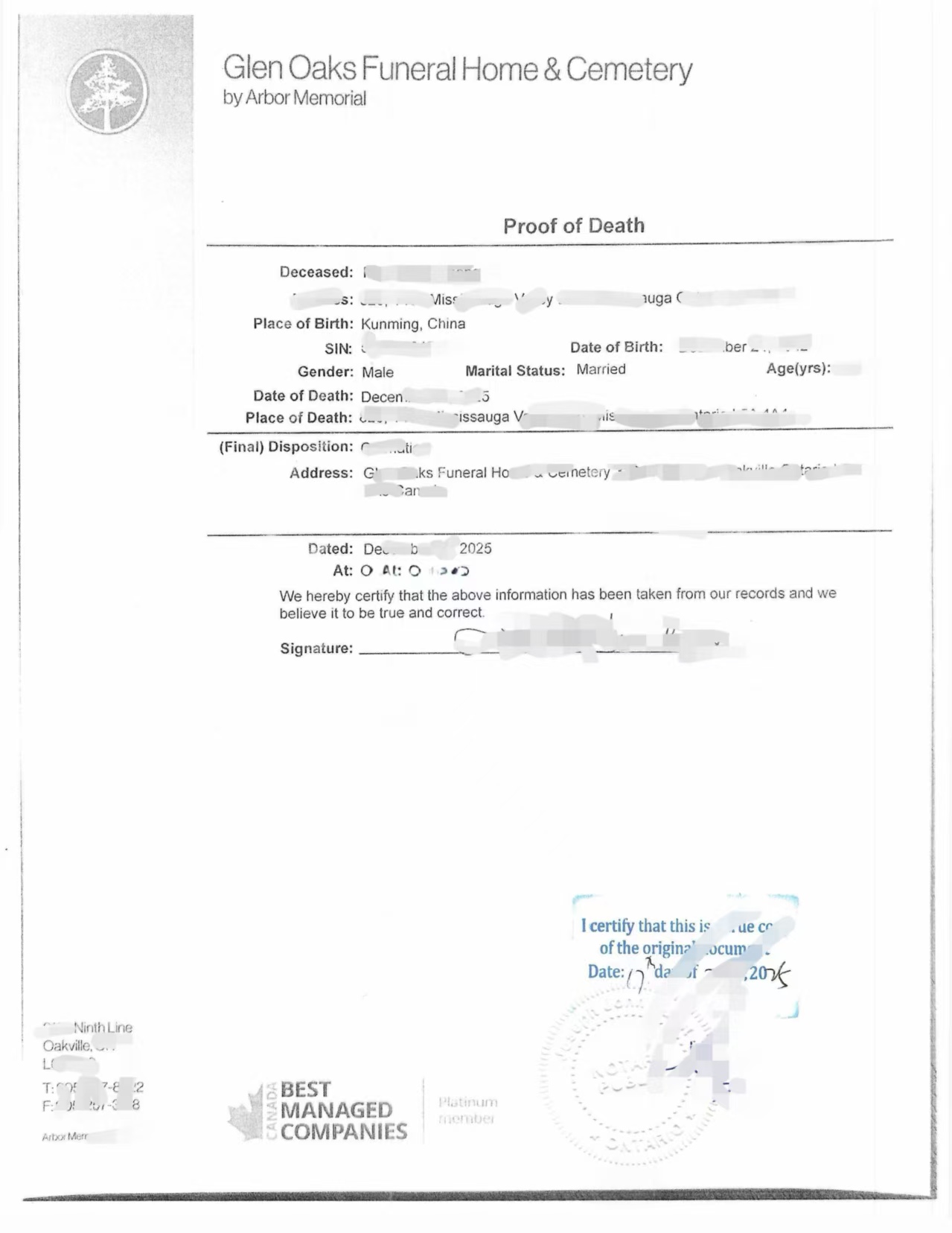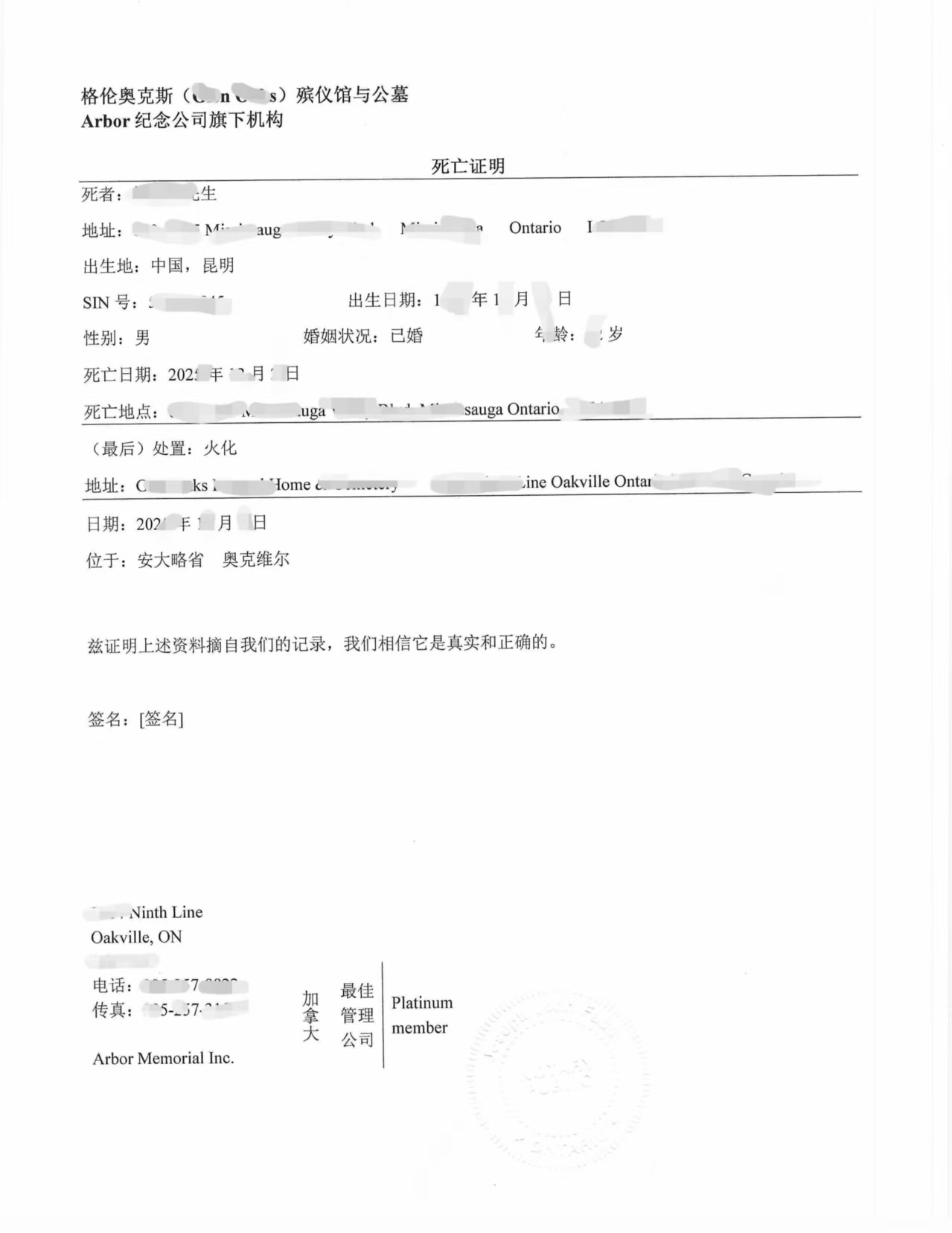 钟先生去世后,其家属通过当地知名殡仪机构 Glen Oaks Funeral Home & Cemetery 办理了相关善后事宜。该机构出具了正式的《Proof of Death(死亡证明)》,文件中载明了逝者的基本身份信息,包括姓名、性别、出生日期、出生地、婚姻状况、去世日期、去世地点等内容,同时明确注明最终安置方式为火化,并列明火化及骨灰安放的殡仪机构名称与地址。该证明文件由殡仪机构负责人签署,并注明出具日期及地点,属于加拿大可用于法律事务的正式文件。