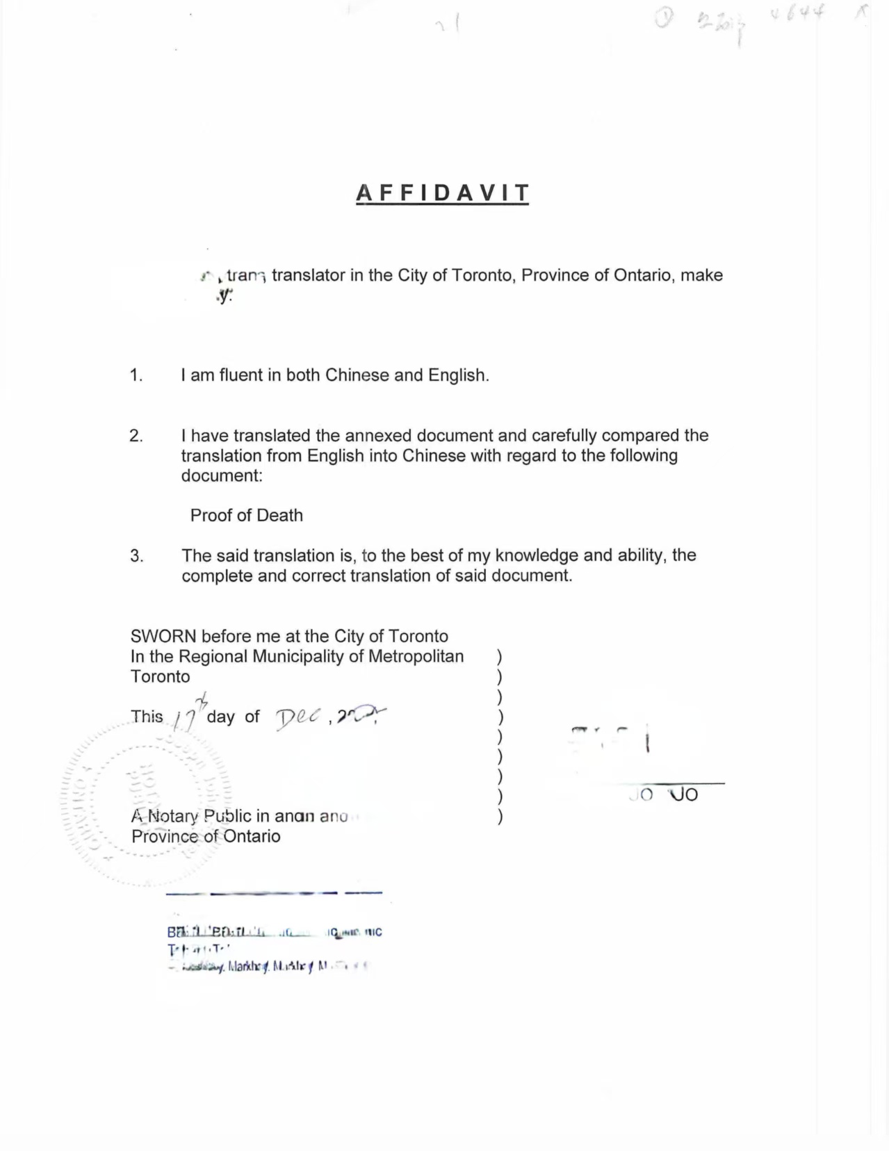 由于该死亡证明为英文文件,且需在中国使用,家属首先安排了中英文翻译,并由加拿大执业译员出具翻译宣誓书,确认译文为对英文死亡证明的完整、准确翻译。翻译内容严格对应原文件信息,包括死亡事实、时间、地点及火化安排等关键要素,确保国内相关部门能够准确理解文件内容。
