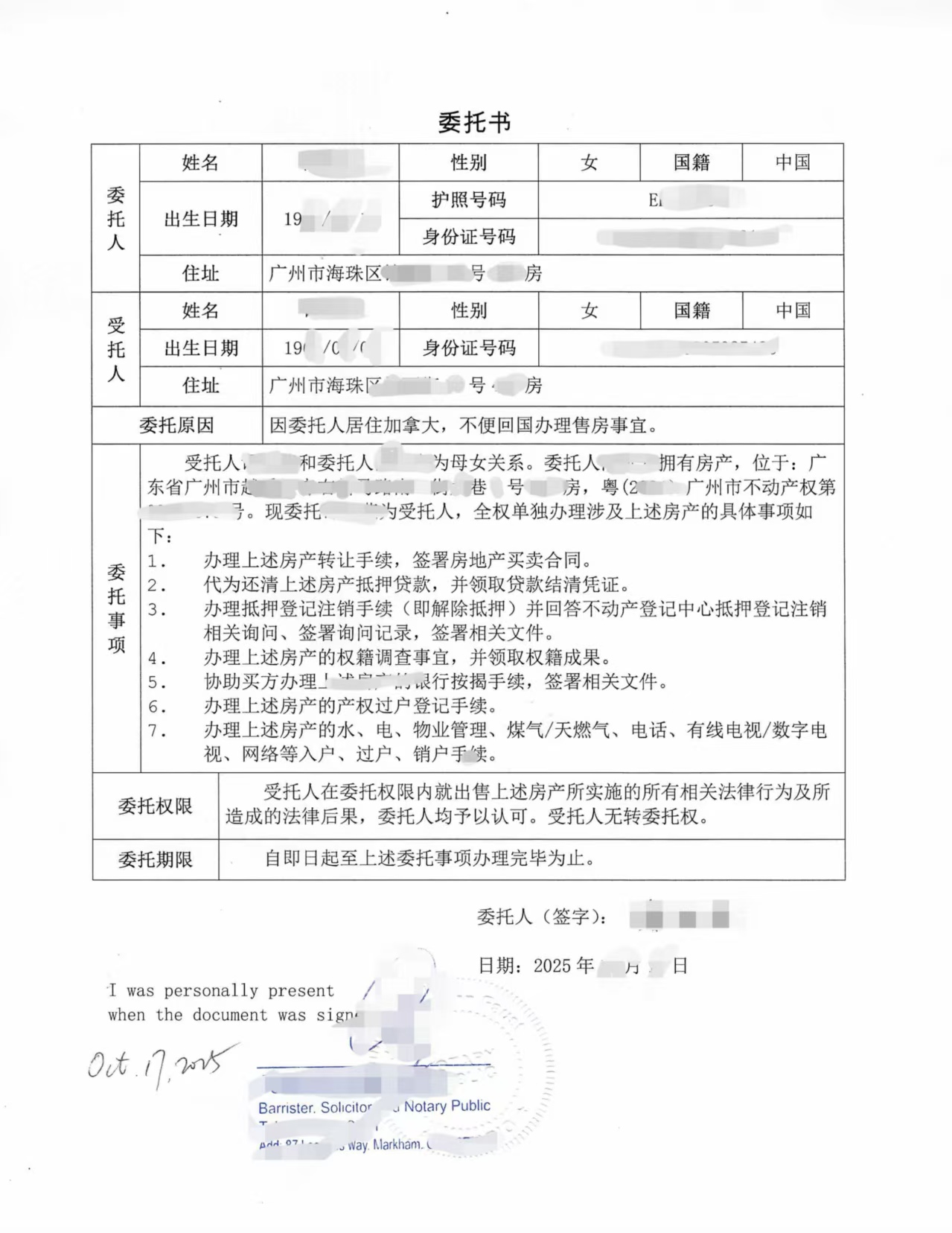 女儿委托母亲出售广州房产海牙认证——中国籍、长期居住国外(PR)案例分享