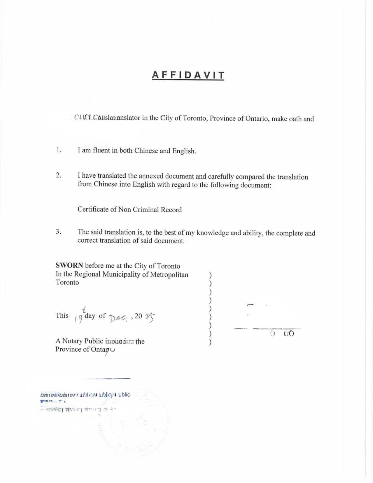 翻译完成后,由加拿大安大略省执业译员出具翻译宣誓书(Affidavit),并在公证官面前完成宣誓。宣誓书中明确声明译者具备中英文双语能力,确认英文译文为对中文无犯罪记录证明的完整、真实、准确翻译。最终成品文件包括:中文无犯罪记录证明复印件、对应英文翻译件以及正式签署的翻译宣誓书,整体装订规范,形式符合加拿大移民部门要求。