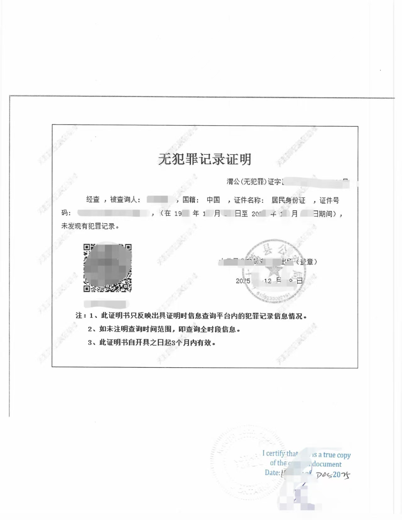 本案例充分说明,陕西公安机关出具的无犯罪记录证明在加拿大用于父母担保移民时,必须配合规范的英文翻译及加拿大本地翻译公证程序,方可确保文件的法律效力与移民合规性