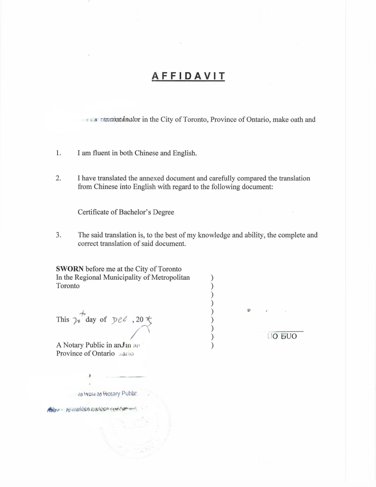 翻译完成后,由加拿大安省宣誓翻译员出具翻译宣誓书,并在公证律师面前完成签署,形成完整的翻译公证文件。最终,该套文件顺利被加拿大相关机构接收使用,为王先生后续的学历评估和个人发展提供了关键支持。