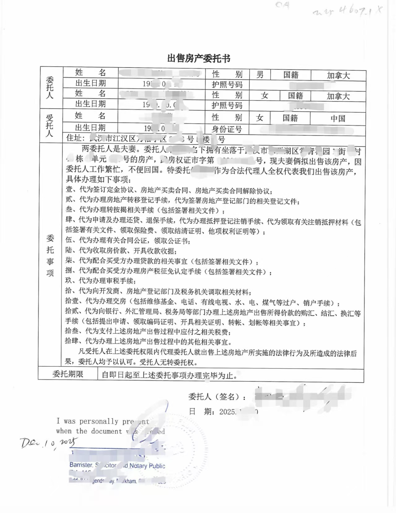 本案当事人为旅居加拿大的华人夫妻(化名:顾先生、沈女士),长期居住在安省。夫妻在国内持有一套住宅物业,因家庭规划调整,决定出售该房产并授权国内亲属代为办理相关手续。但由于当事人无法回国亲自到场签字,国内受理窗口明确要求:境外出具的出售房产委托书须完成当地公证,并办理**海牙认证(Apostille)**后方可使用。
