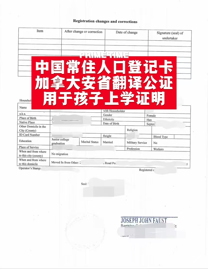 常住人口登记卡(登记人为李明、王芳、李阳)、孩子上学证明、夫妻关系证明。所有材料均需由华译网翻译公证处完成翻译与公证,确保译文准确、公证流程合规,符合安省入学及相关官方审核要求。