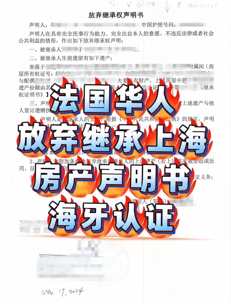 法国华人放弃继承上海房产声明书海牙认证