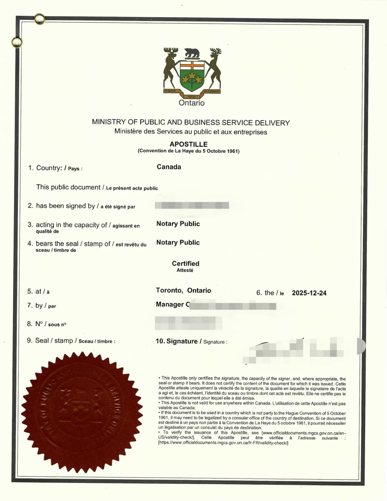 文件准备完成后,张先生在加拿大当地完成签字,并由安省执业公证人对声明书进行公证,确认签署行为的真实性。随后,文件递交至安省主管部门办理海牙认证(Apostille)。海牙认证页载明文件签署人身份、公证人资格及认证日期,用于证明该公证文书在国际间的法律效力。