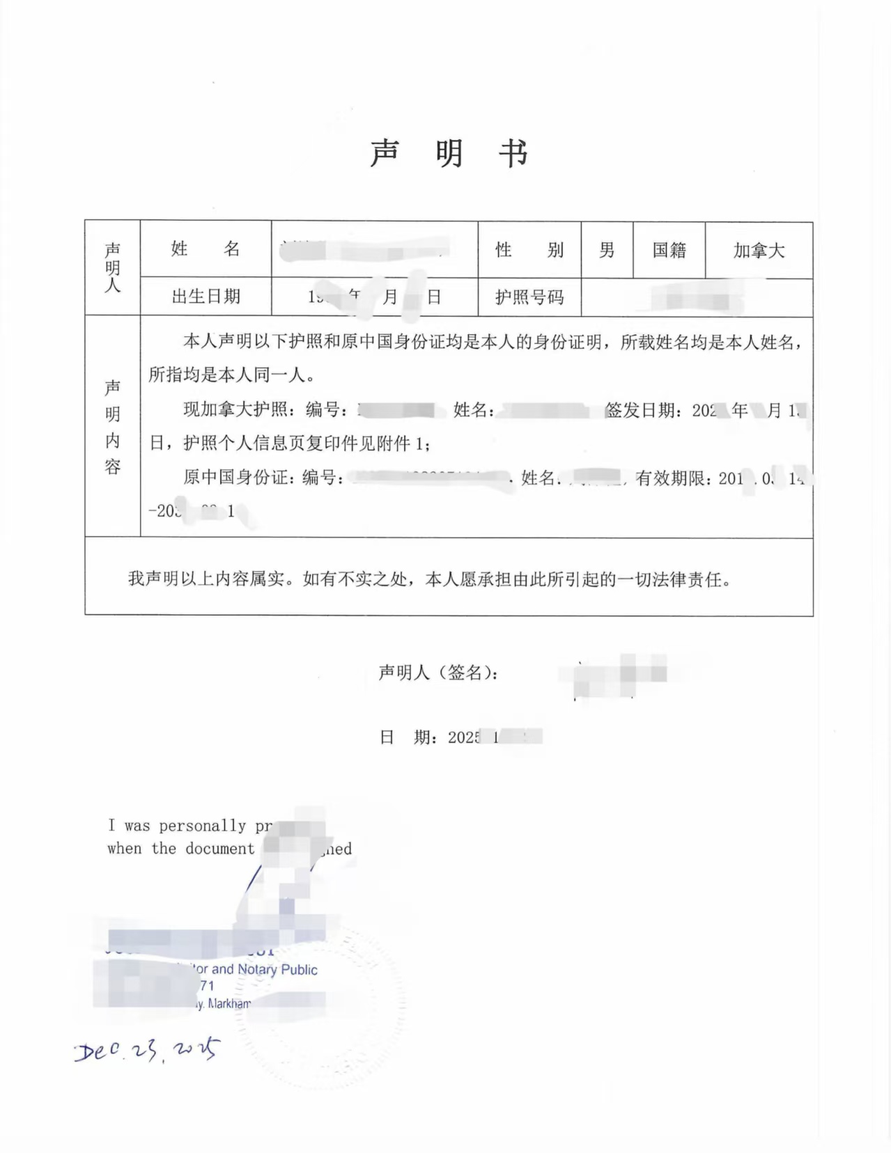 张先生(化名)为旅居加拿大多年的华人,已加入加拿大国籍,现持加拿大护照长期居住在安省。近期,张先生因办理中国境内房产过户及银行事务,被要求提交“同一人声明书”,以证明其加拿大护照英文姓名与原中国身份证中文姓名系同一人使用。