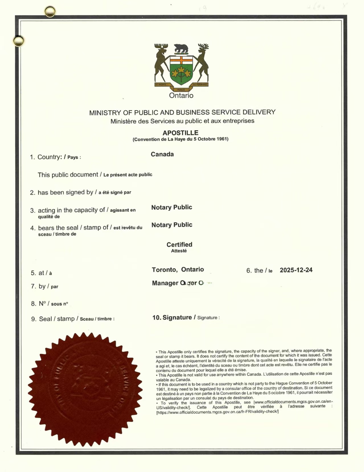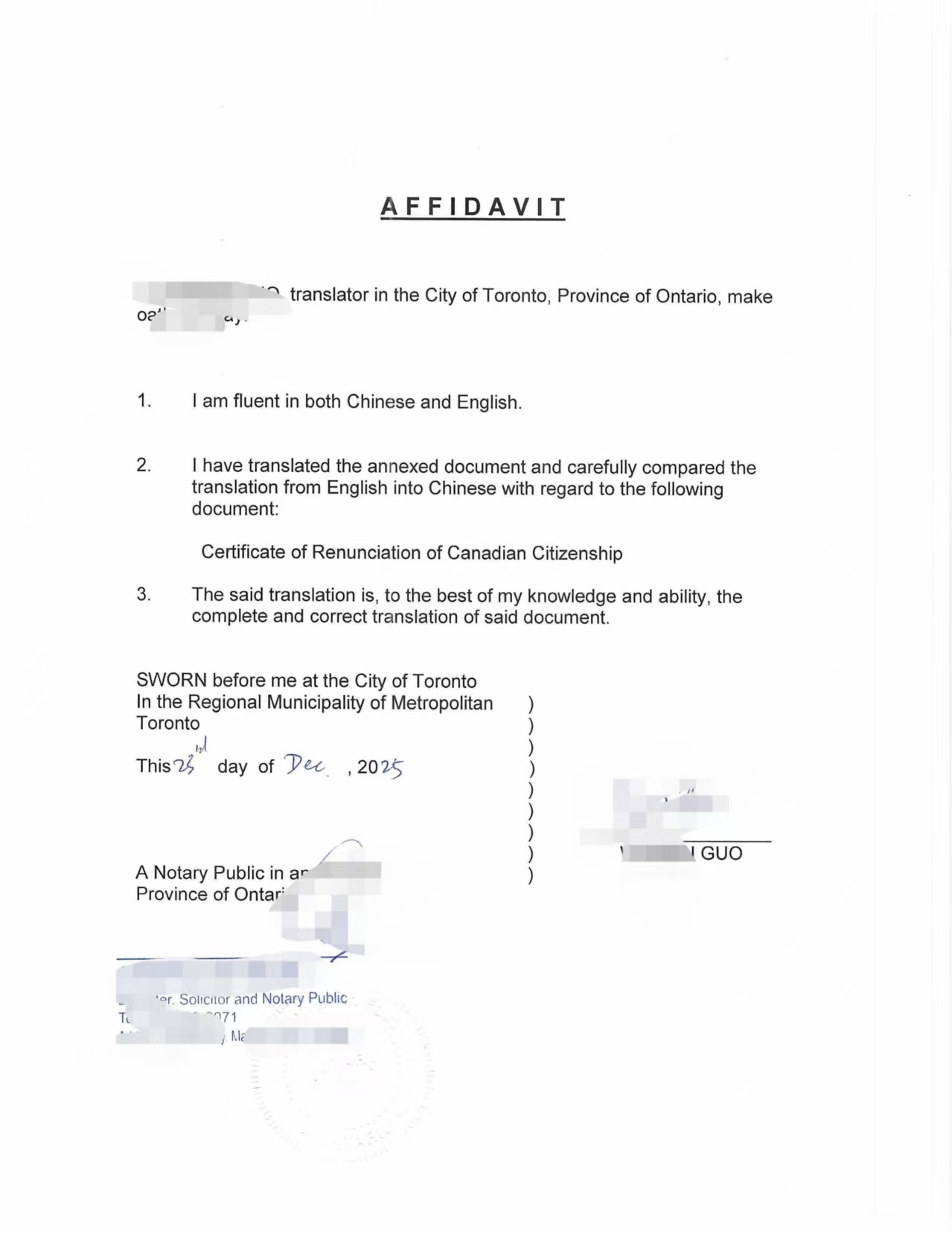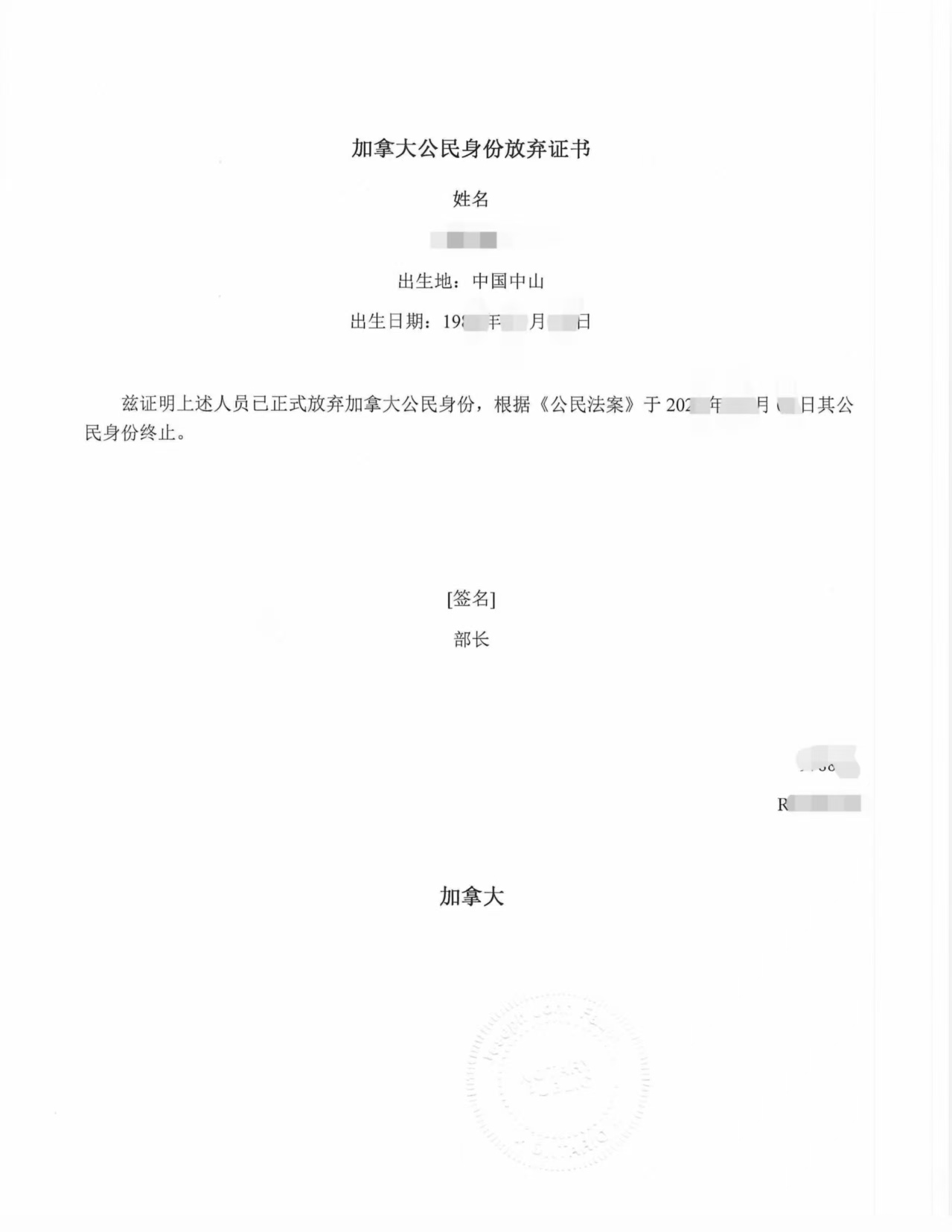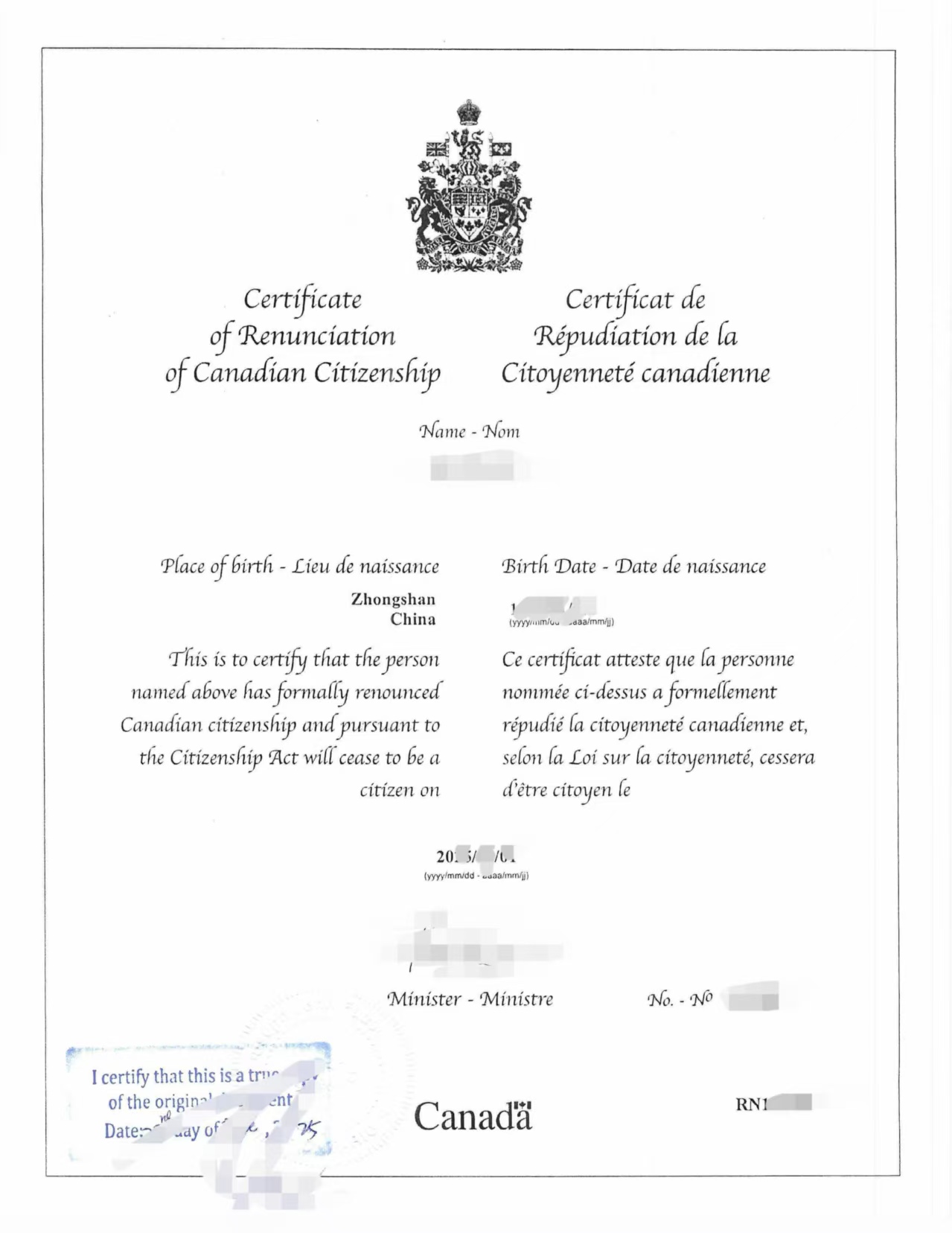 顾女士,出生于中国,曾加入加拿大国籍。因后续身份及国内事务需要,已依法办理加拿大公民身份放弃手续,并取得加拿大政府签发的《加拿大公民身份放弃证书》(Certificate of Renunciation of Canadian Citizenship)。目前当事人人在中国,需将该退籍证书用于国内相关部门备案及身份认定,因此需要办理海牙认证及配套的认证翻译。