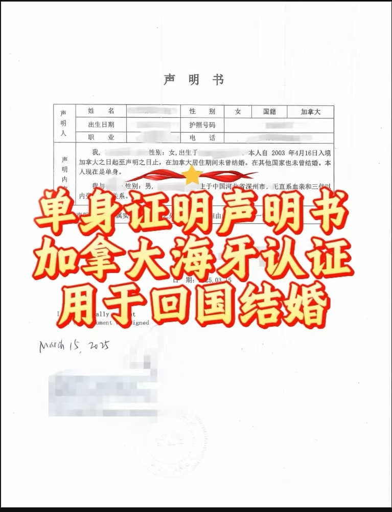 中国公民在加拿大永居单身证明声明书回国结婚,需完成海牙认证手续以确保文件有效性,华译网翻译公证海牙认证处可提供全流程办理服务,高效便捷解决跨国婚姻文件合规问题。 办理流程主要分为三步。