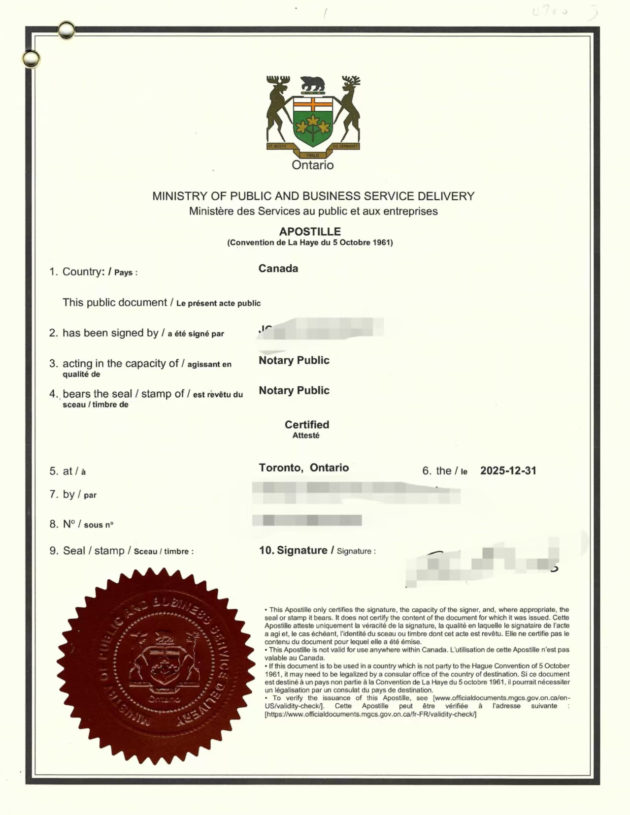 公证完成后,将文件递交安省政府主管部门办理海牙认证;