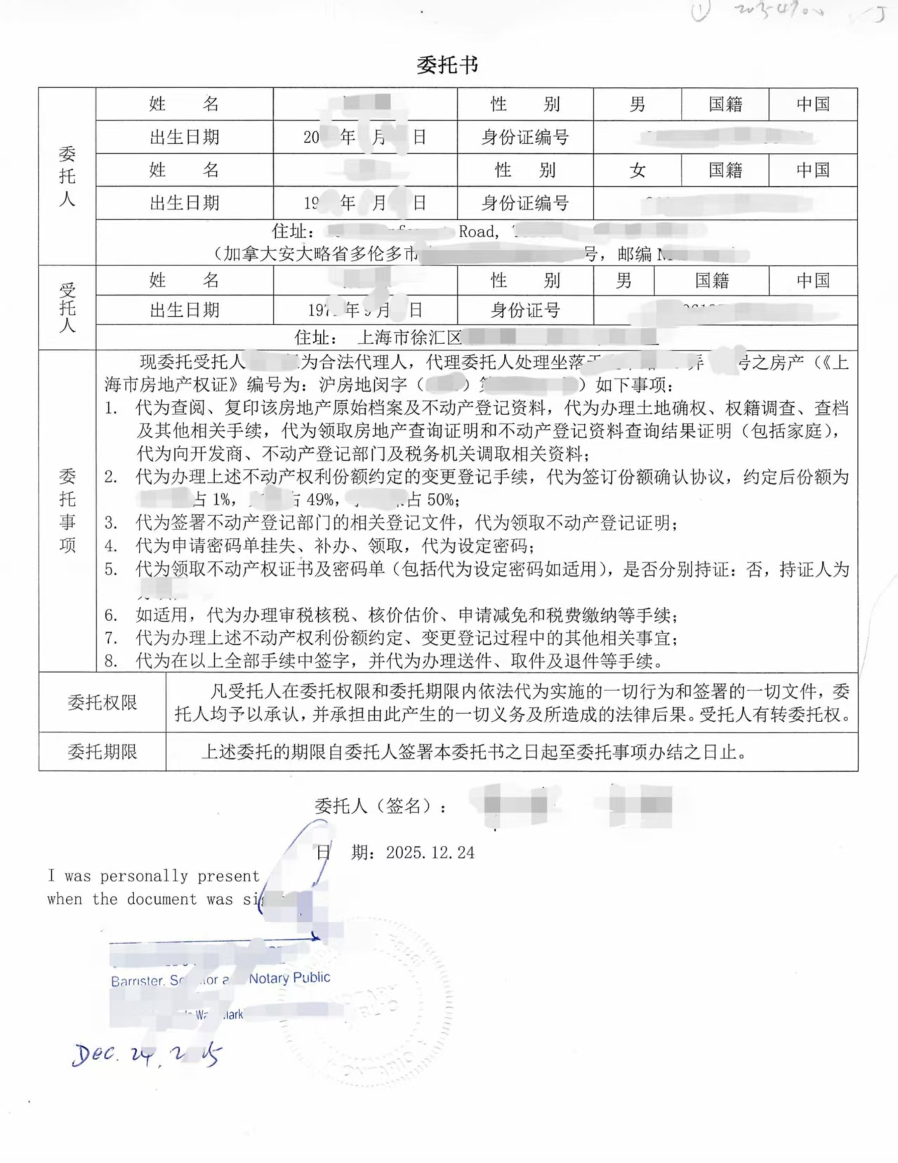 对于海外华人家庭共同持有国内房产的情况,通过“一人回国办理、其他家庭成员在境外出具委托书”的方式极为常见。只要委托内容明确、份额约定清晰,并在境外完成合规的律师公证与海牙认证,即可有效解决跨境办理房产事务的现实问题。本案也体现了家庭成员多方参与时,委托书在实际操作中的重要性。