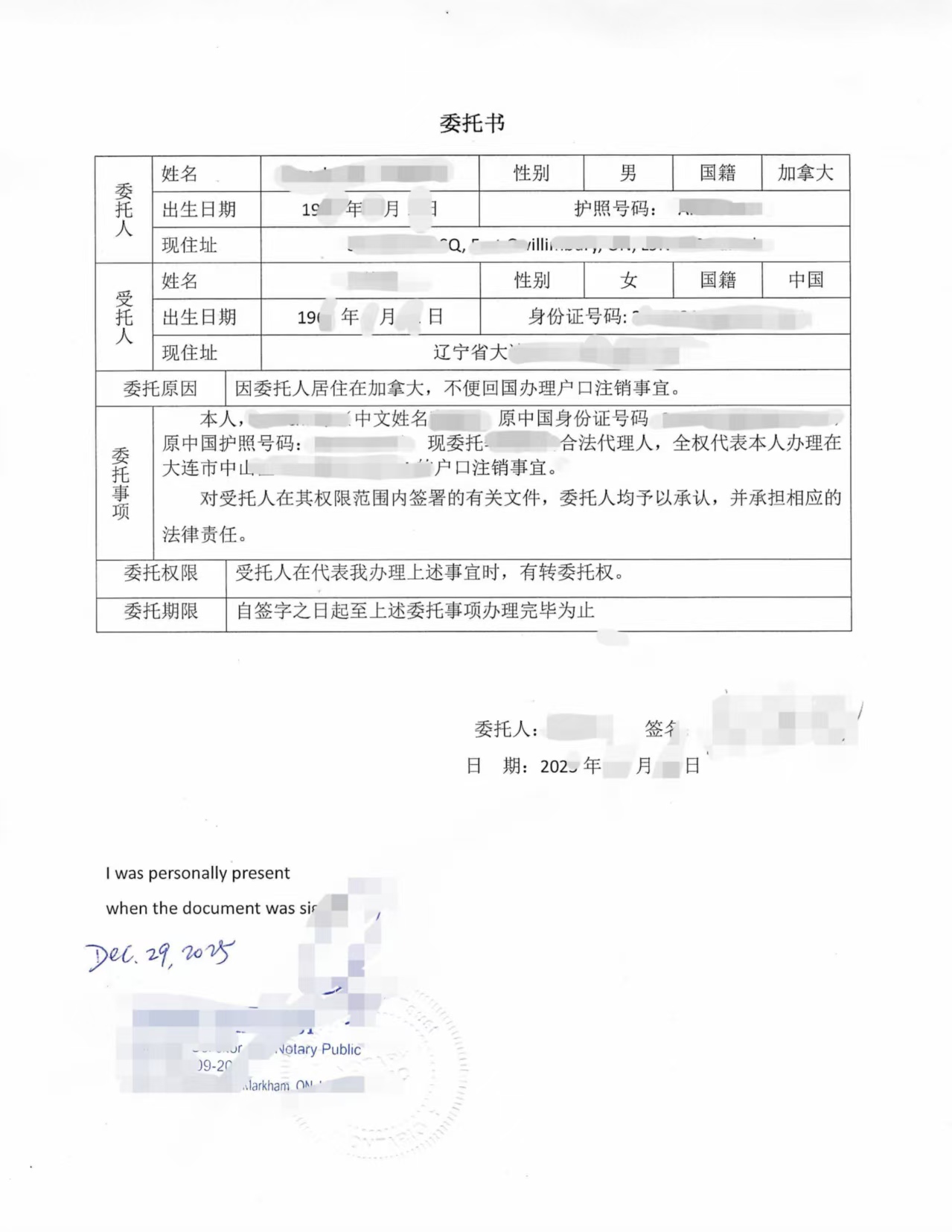 当事人为已长期居住在加拿大的华人男性,早年在国内仍保留户籍信息。因个人身份状态变化及国内相关事务需要,需在国内办理户口注销手续。但本人短期内无法回国,遂决定在加拿大出具委托书,委托国内亲属代为办理户口注销相关事项。