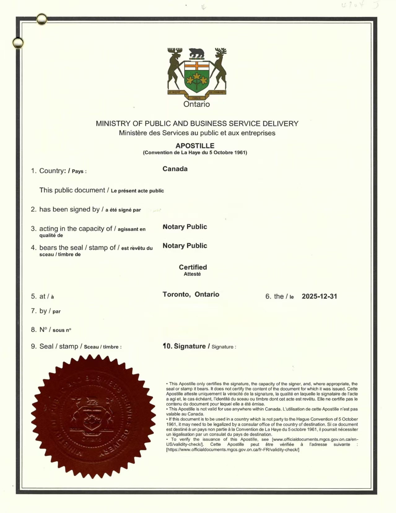 公证完成后,递交安省政府主管部门办理海牙认证;