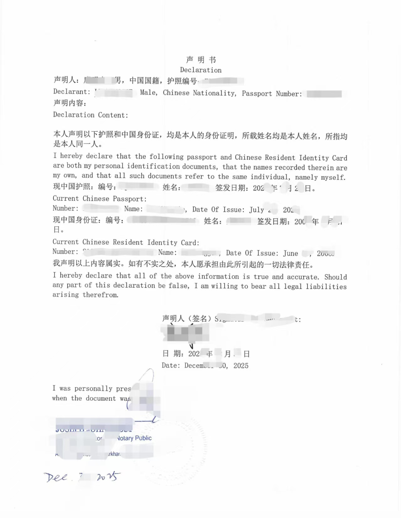 声明人目前持有的中国护照与中国居民身份证均为本人合法身份证明文件;