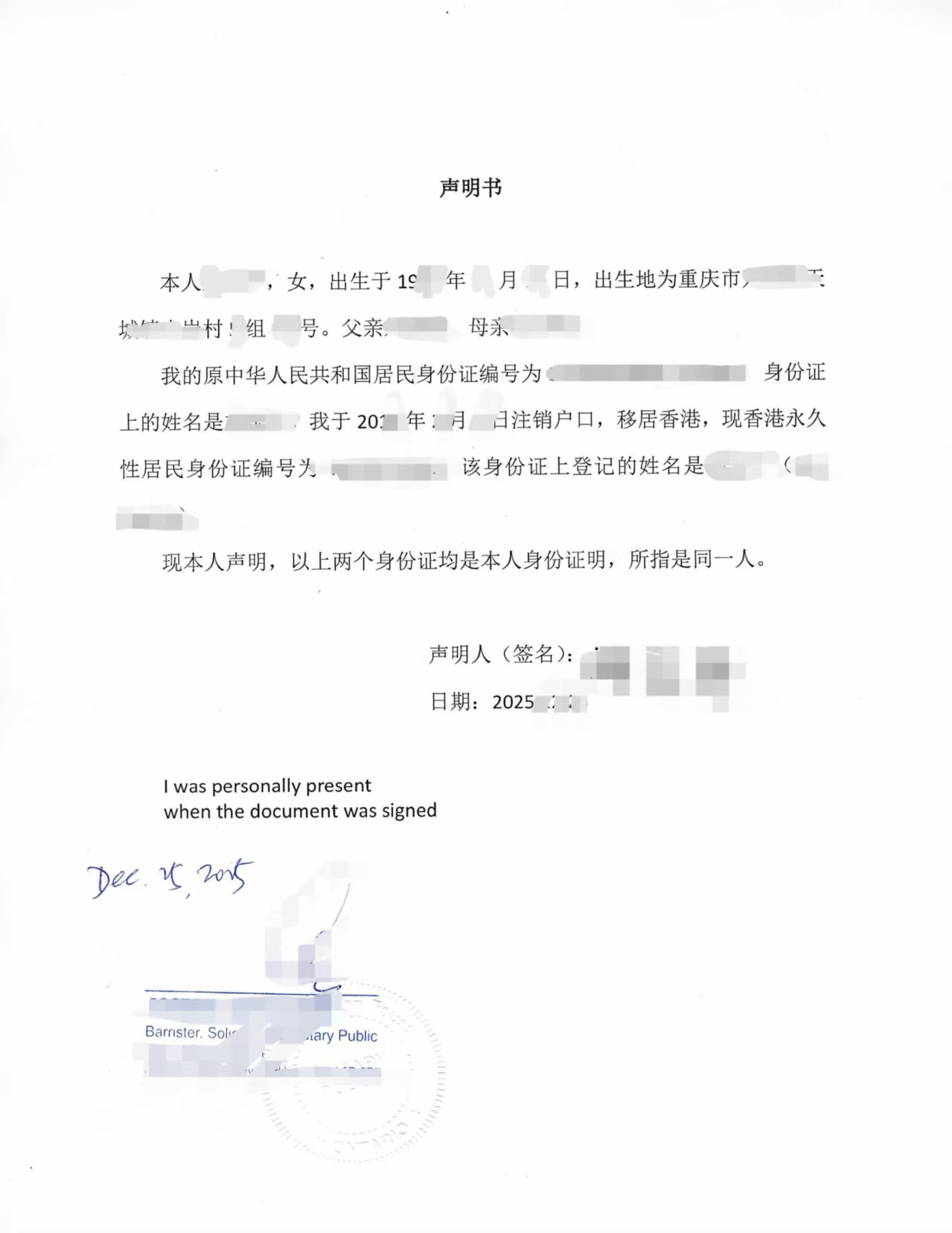 20254699 海牙认证样本 中港身份证同一人声明书 pdf