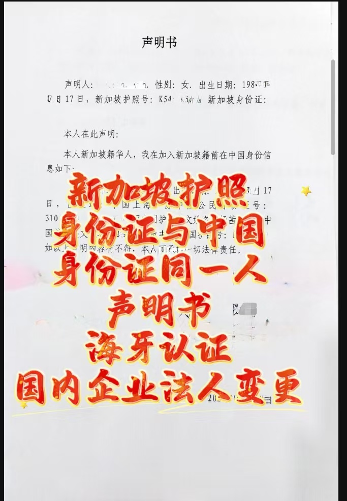 对于持有新加坡护照、需办理国内企业法人变更的人士,“同一人声明”的海牙认证是关键环节。