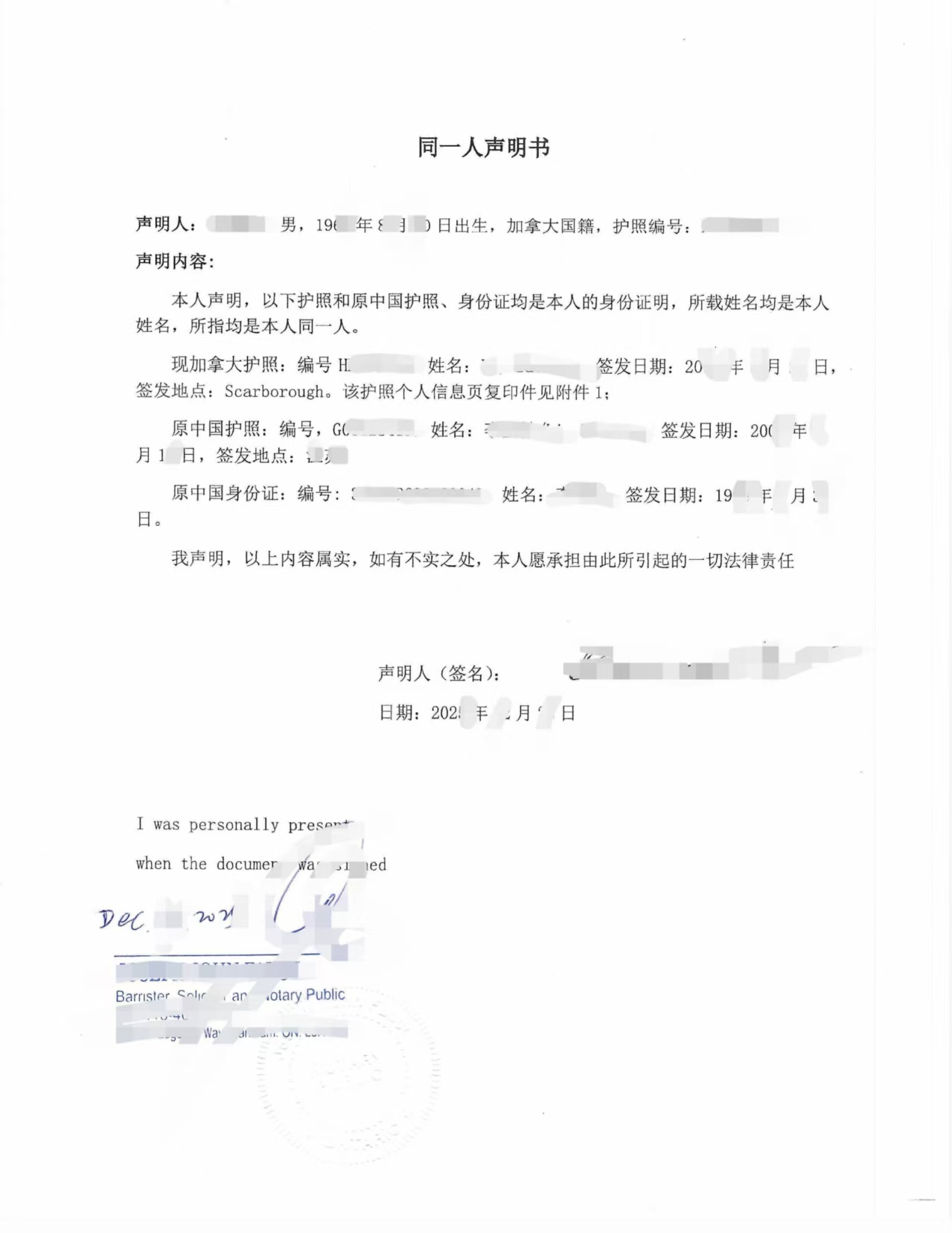 李先生通过远程方式委托我司办理同一人声明书的公证及海牙认证。我司在接受委托后,结合江苏徐州地区继承公证的实务要求,协助其规范起草《同一人声明书》,清晰列明加拿大护照、中国护照及中国居民身份证之间的对应关系,并明确声明上述证件所载人员为同一人。
