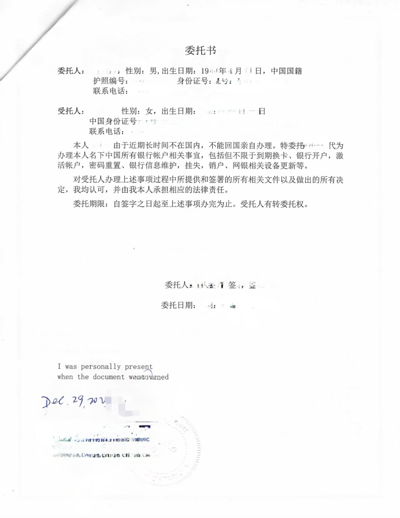 委托人张明(化名)因长期旅居海外,无法亲自处理国内银行业务,特委托华译网办理相关委托文书的撰写、公证及美国州海牙认证全套服务,并授权受托人代为处理国内银行业务。
