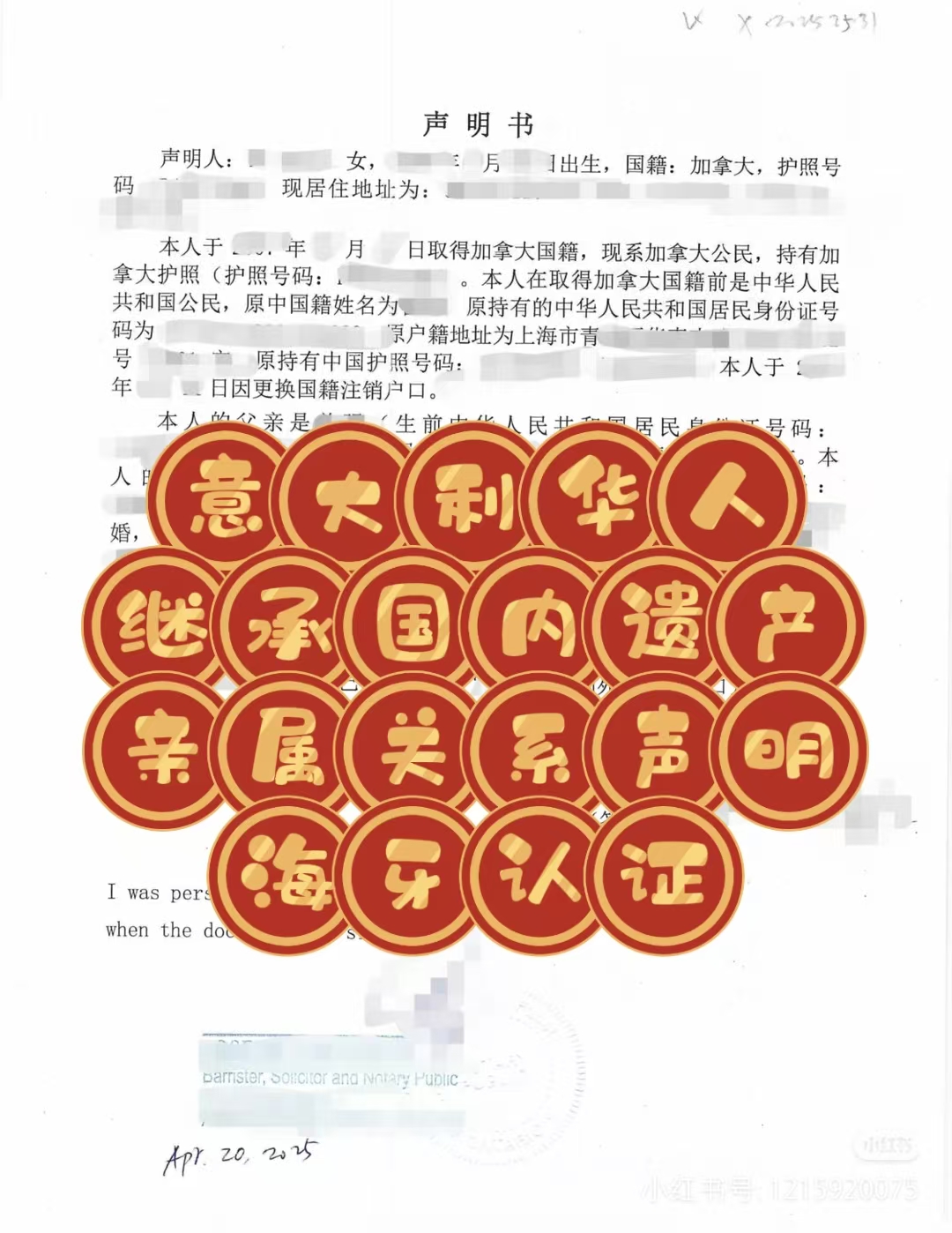 意大利华人继承国内父亲遗产,亲属关系声明海牙认证是关键环节,直接影响遗产继承的合法性与效率。作为国际通用的文书认证形式,海牙认证可让文件在120余个公约成员国直接生效,免去繁琐领事认证流程。