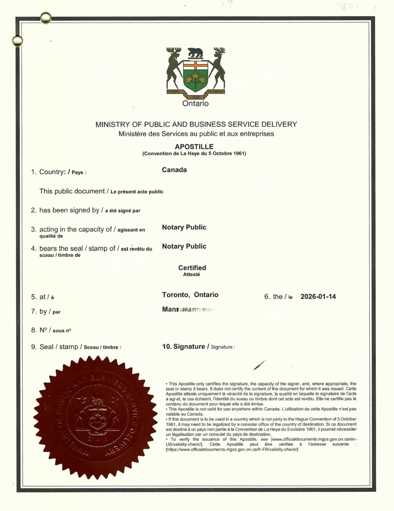 随后,由加拿大本地执业公证人出具复印件属实公证声明,明确说明所附文件系李女士加拿大护照资料页及其中的中国签证页复印件,并注明仅用于特定行政用途。完成公证后,文件即递交至省级主管部门办理海牙认证(Apostille),全程严格按照中国出入境管理局的实际审查标准把控内容与形式。
