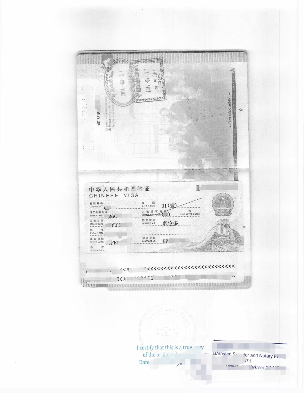 加拿大旧护照中国签证页海牙认证附加证明书
