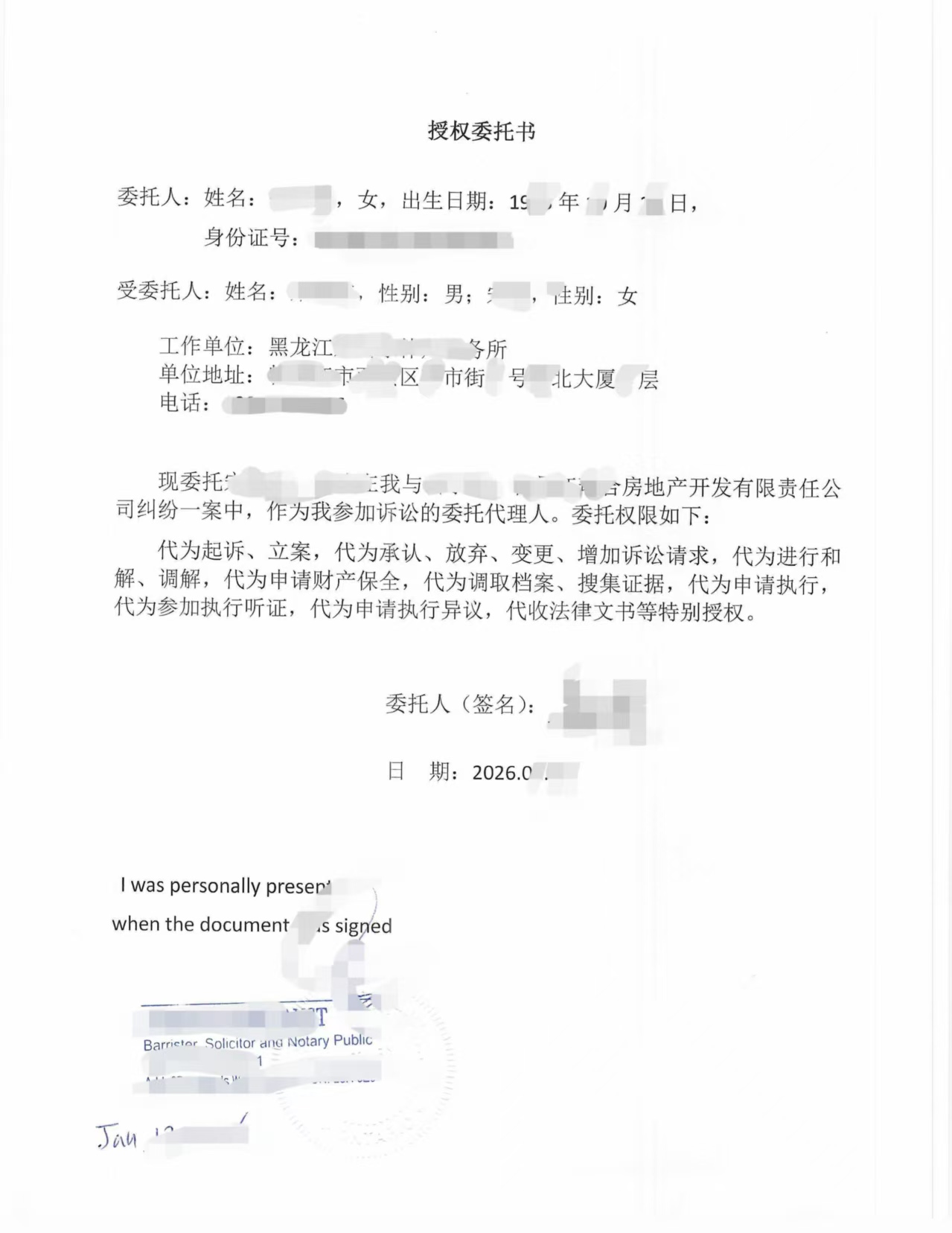 2025年,客户因产生新的国内事务需求,需要出具一份授权委托书,以便委托国内人员代为处理相关事宜。根据国内使用机构的明确要求,该委托书需在加拿大完成**公证及海牙认证(Apostille)**后方可使用。客户在第一时间再次联系我司,明确表示希望继续由熟悉其情况的机构协助办理。
