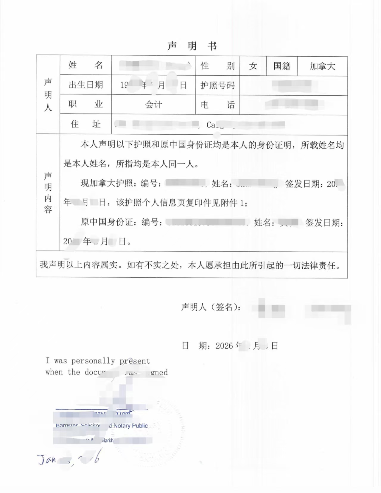 由于当事人目前主要使用海外护照,其姓名拼音、证件类型与原上海身份证存在形式差异,国内部门无法仅凭护照直接完成身份核验。因此,当事人需出具一份同一人声明书,明确说明:上海身份证所载身份信息与现持海外护照系同一自然人,并对声明内容的真实性承担相应法律责任。