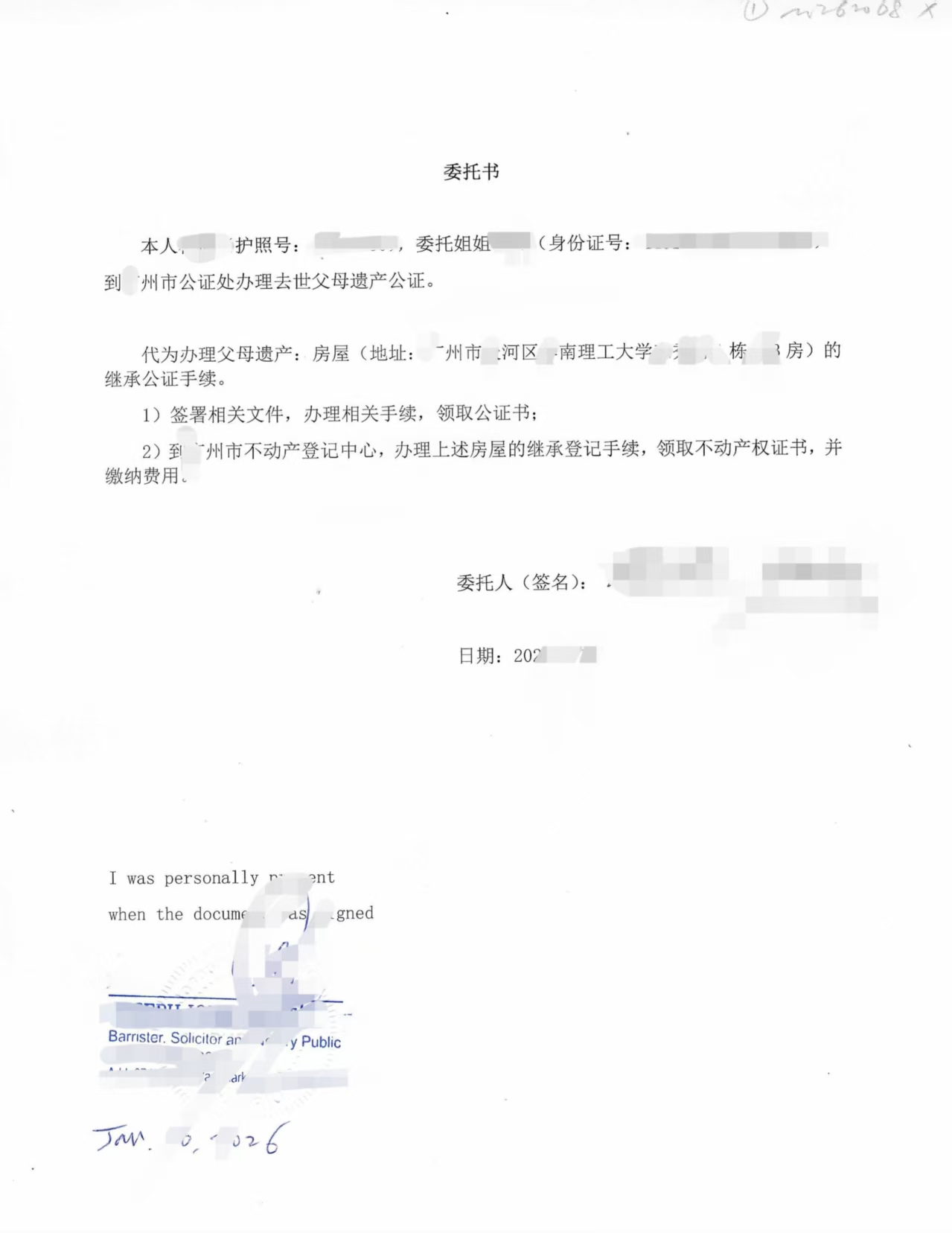 到广州市公证处办理去世父母遗产公证、签署继承相关文件、提交材料、领取公证书,以及配合后续不动产继承登记等事项。随后,我们对委托书文本进行合规性审核,确保其符合国内继承公证及不动产登记的实际操作要求。