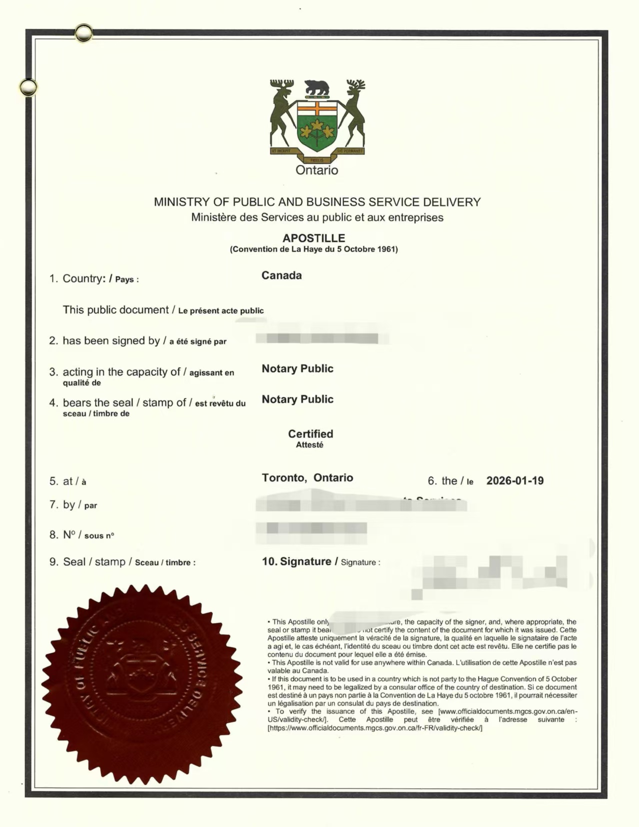 委托书定稿后,我们安排加拿大本地律师完成签名见证公证,并在此基础上向主管部门递交海牙认证申请。整个流程衔接顺畅,文件格式规范、认证信息完整,符合《海牙公约》项下跨境文件使用要求。