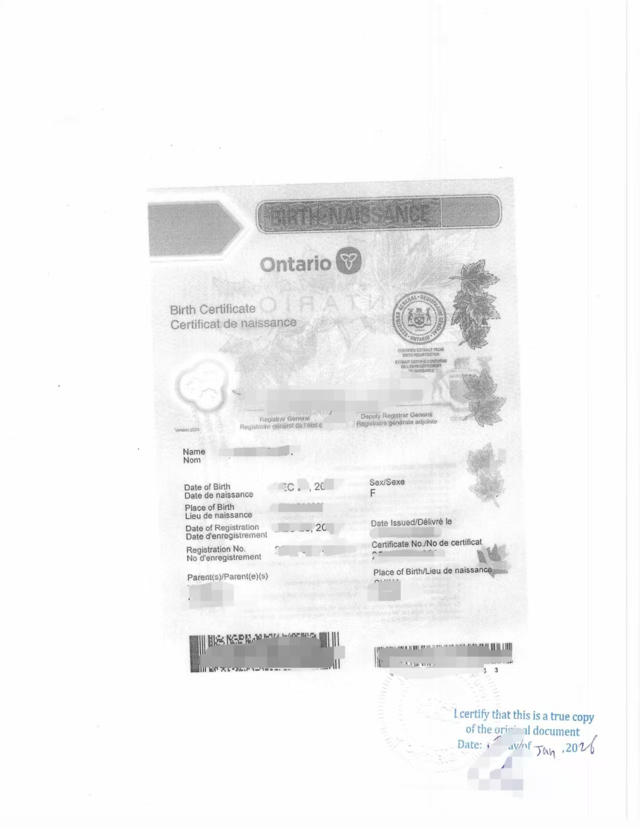 进入 2026 年,此前被推荐的客户再次联系到我们,这次委托办理的是一份加拿大出生证的海牙认证,用于跨境家庭事务。该文件属于典型的加拿大政府签发文件,对公证形式、复印件认证、日期逻辑及认证顺序均有明确要求。我们协助客户完成文件核对、律师公证及海牙认证申请,并在较短周期内完成全部流程,文件最终被相关机构认可使用。
