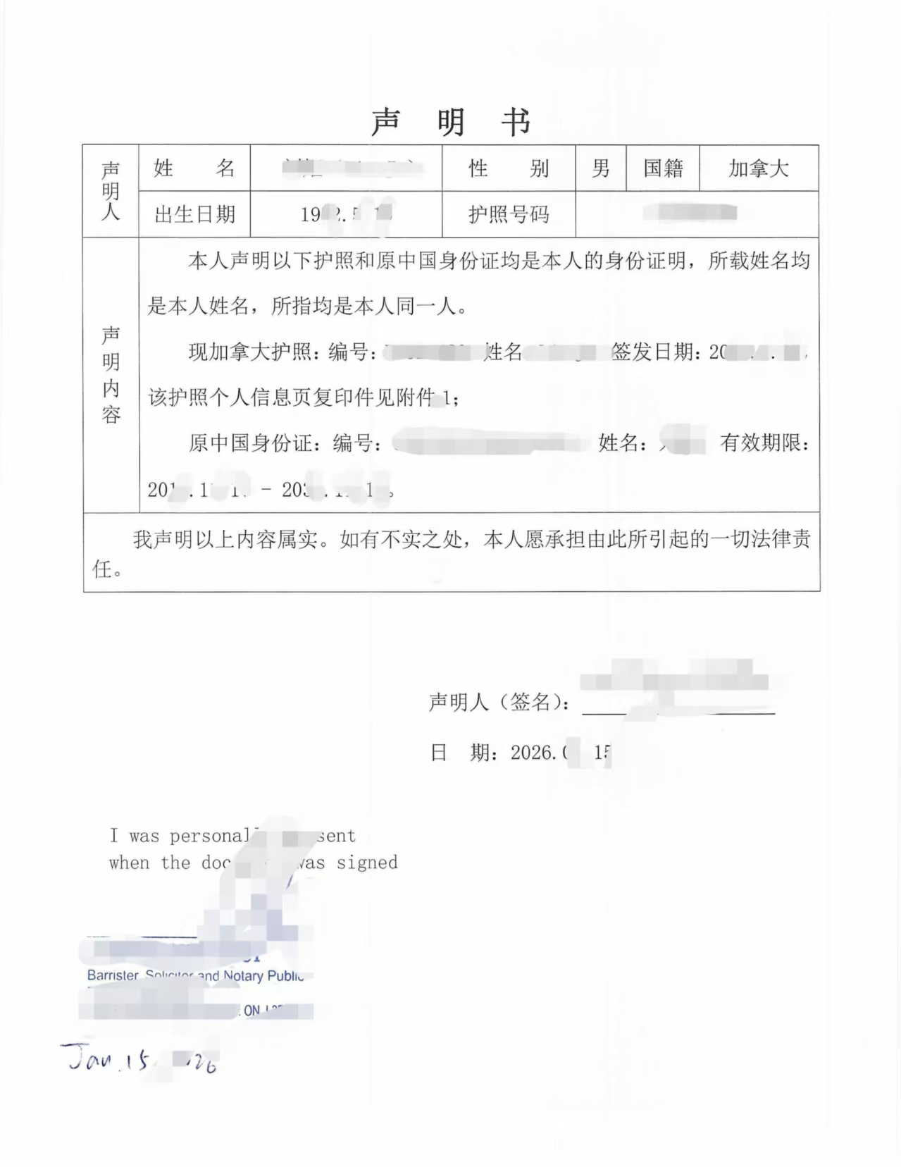 办理“同一人声明书”(证明中国身份证姓名与外国护照姓名为同一自然人),其核心目的在于身份连续性与一致性证明,而非户籍状态变更。