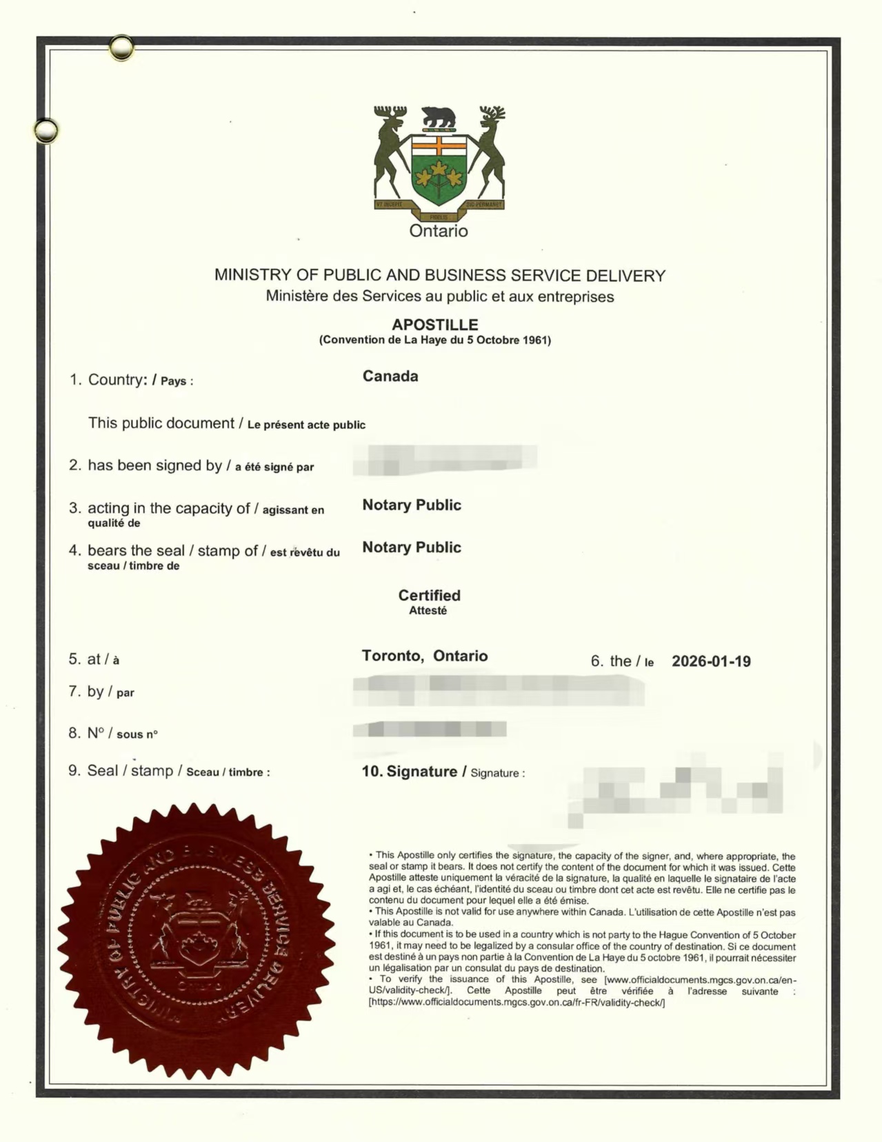 文件由安省执业公证人当面见证签署,并在安省官方渠道完成海牙认证(Apostille)。整个流程清晰、衔接顺畅,当事人无需往返奔波,仅按指引配合即可完成。成品文件结构规范、表述严谨,符合国内公证处及相关部门的审查习惯。