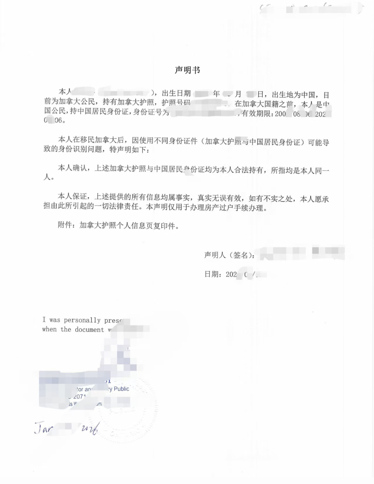 多伦多当事人因早年使用中国身份证,后取得加拿大护照,在办理国内房产及银行相关事项时,被要求出具“同一人证明”,以确认中国身份证与加拿大护照系同一自然人。我们在前期即详细核对其身份材料,包括中国身份证信息、加拿大护照信息及使用背景,协助当事人梳理声明逻辑,避免国内使用环节产生歧义。