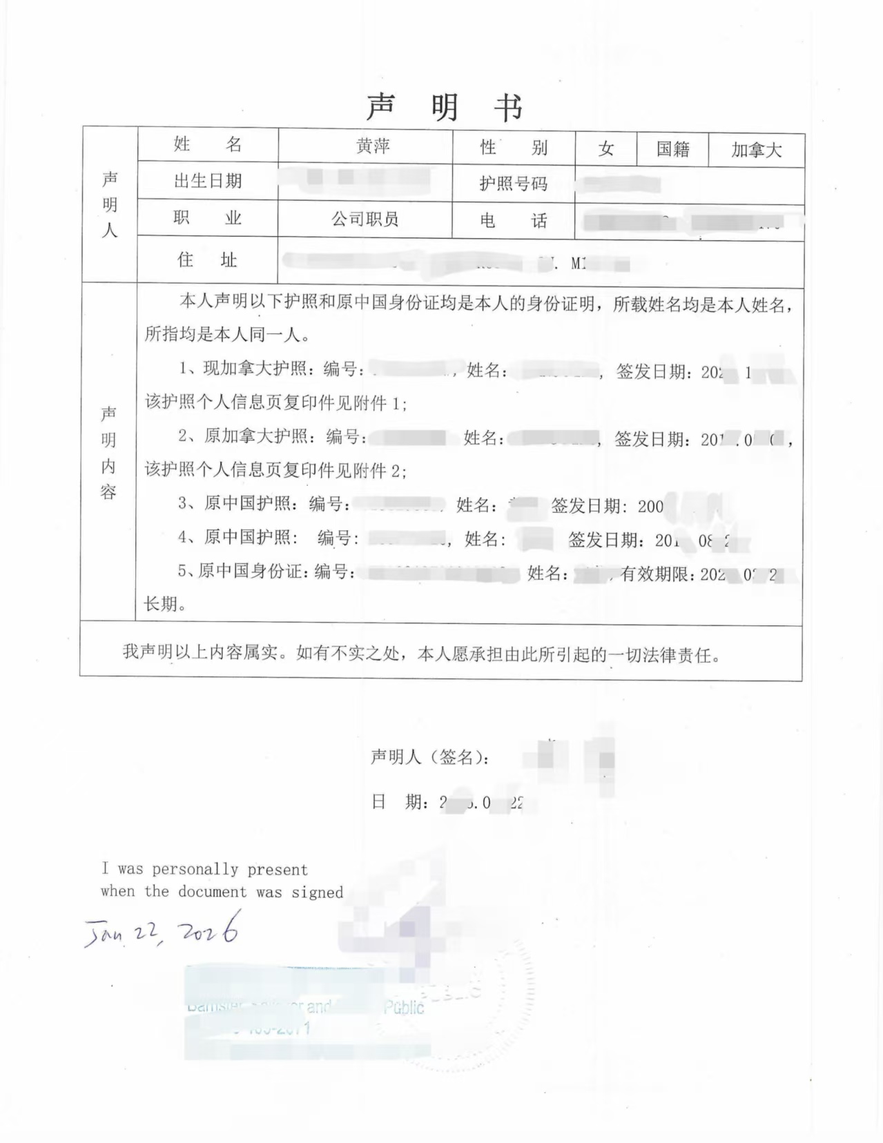 在这种情况下,原有的同一人声明书通常无法直接沿用,尤其是涉及房产、银行、法院、公证处等正式用途时,国内机构往往要求基于“最新有效证件”重新出具同一人声明并完成认证。