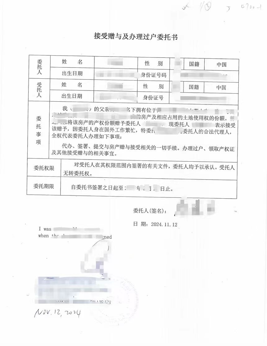 首先委托人吴先生(化名)提供委托书草稿、护照扫描件、房产证明及受托人身份证明,华译网专业团队协助完善委托书内容,明确赠与权限、期限及房产详情,规避模糊表述导致的退件。随后由萨省持牌公证员对文件公证,核实身份及签字真实性。