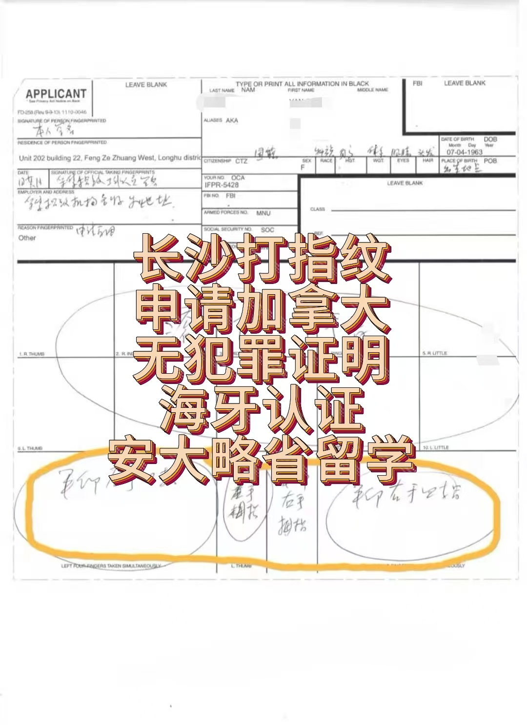 长沙打指纹申请加拿大无犯罪证明海牙认证
