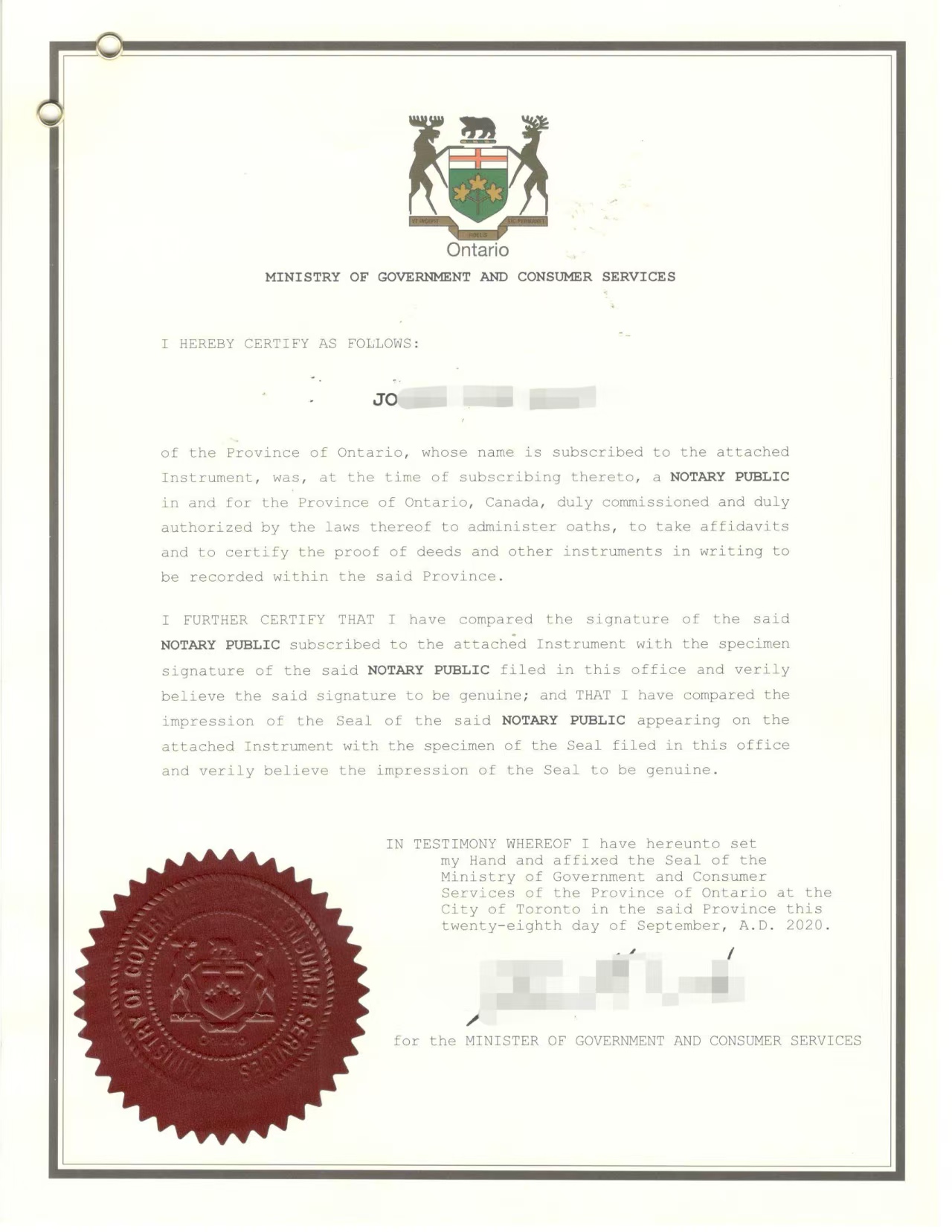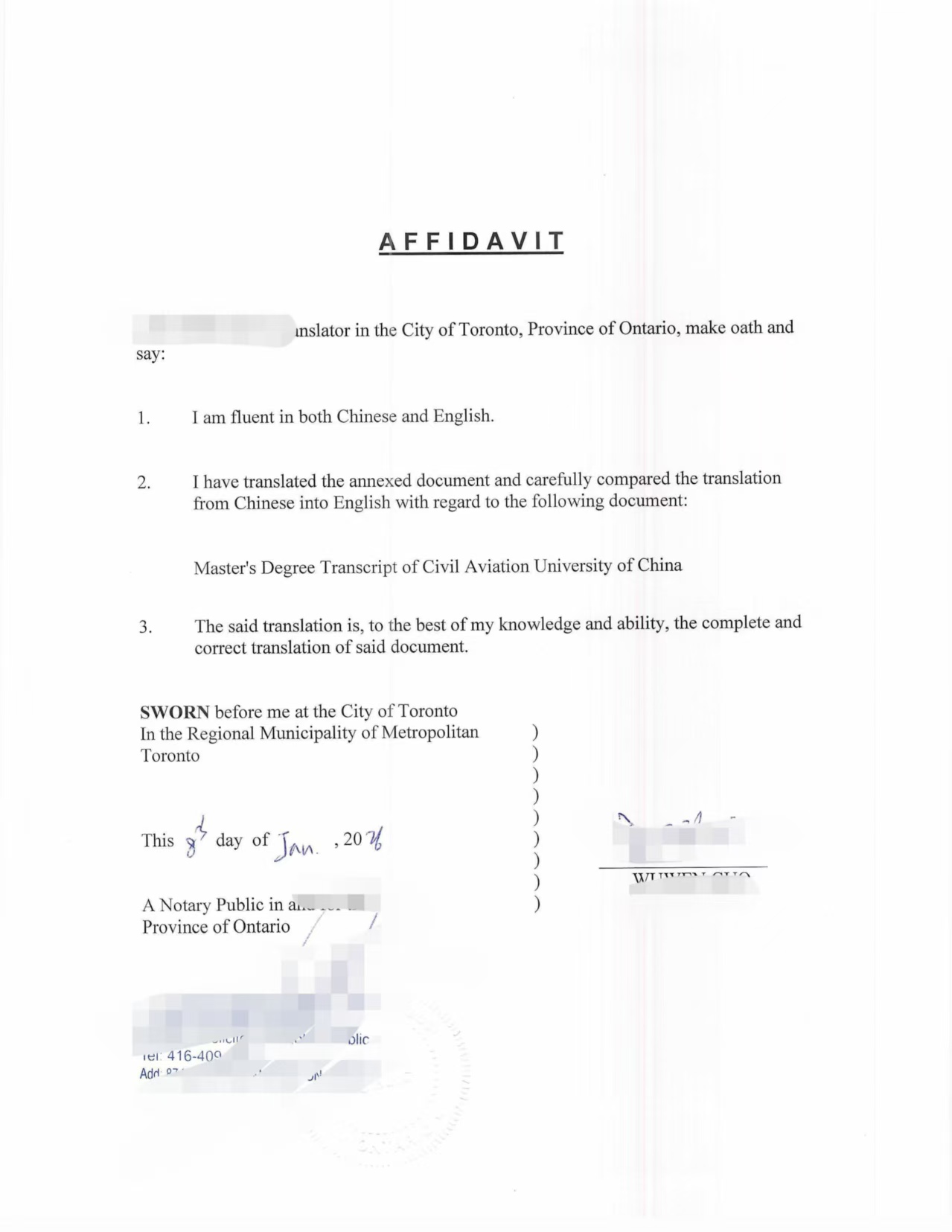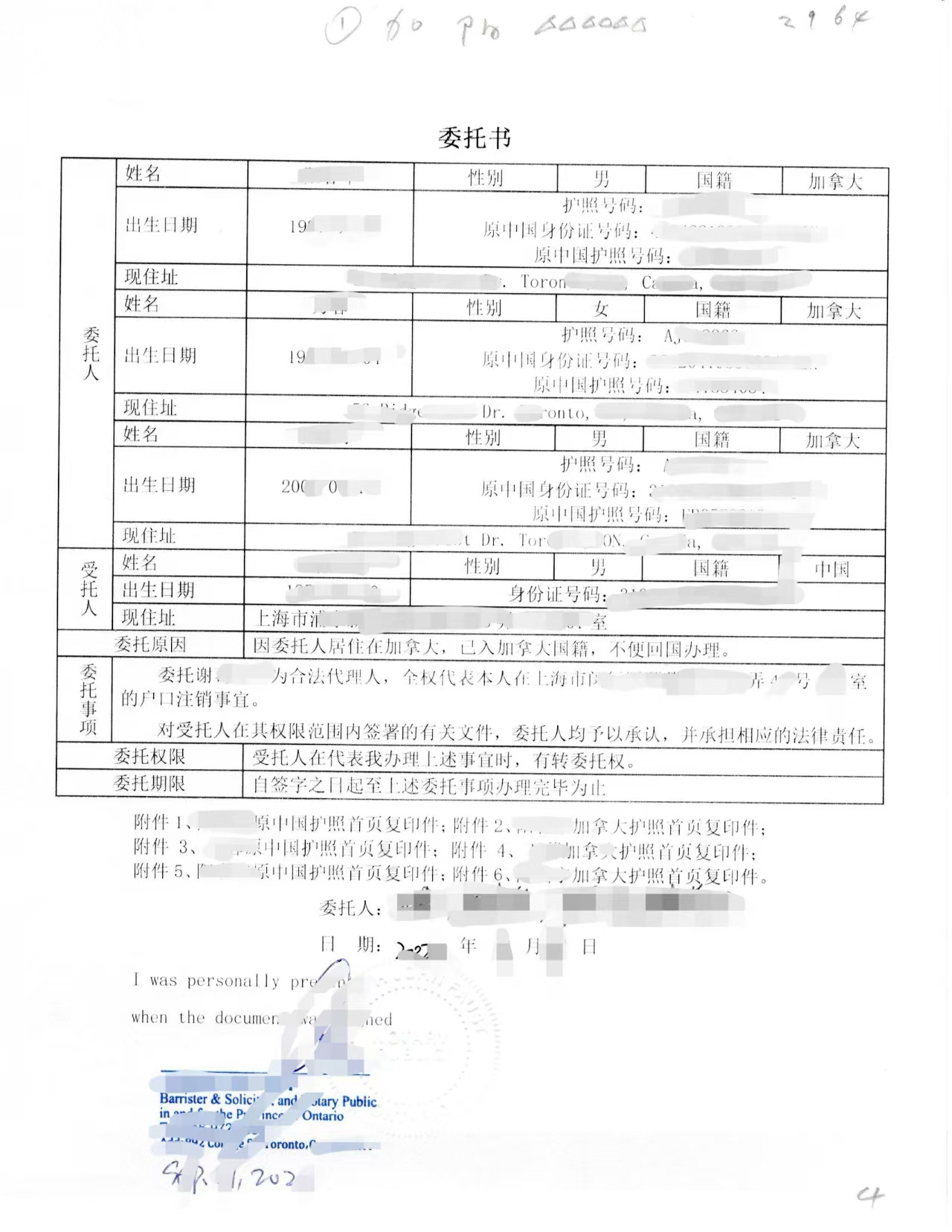 采用翻译 + 加拿大律师公证形式