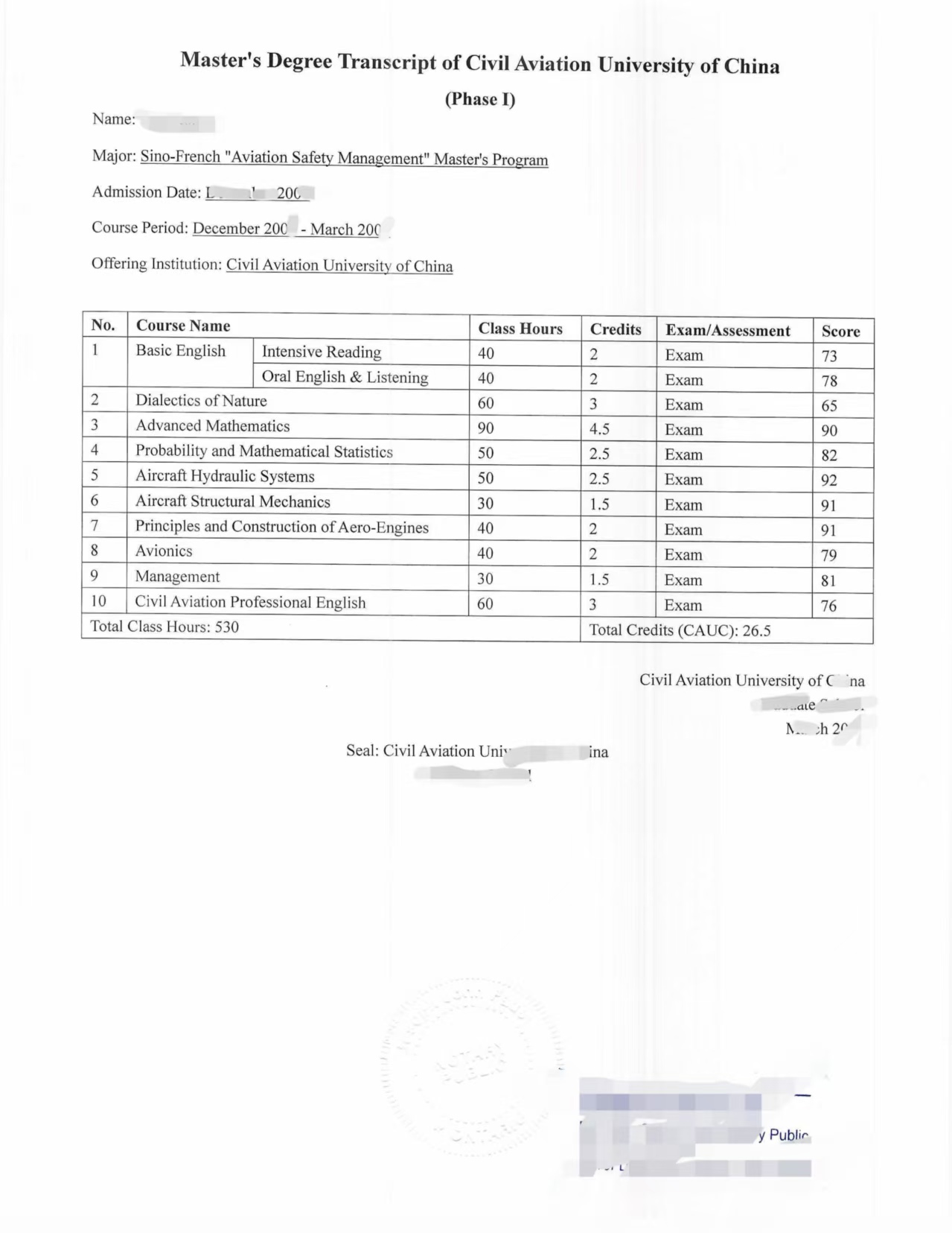 20262012 材料1 翻译公证样本 中国民航大学硕士研究生成绩单 评价 pdf