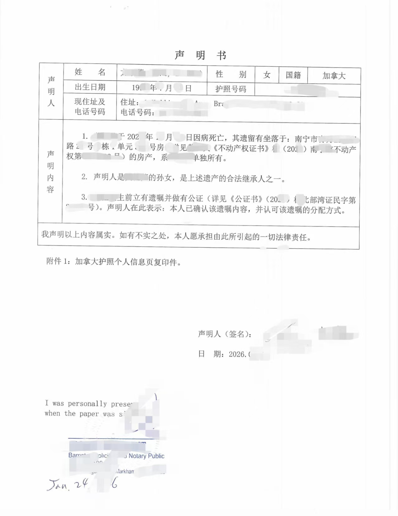 本案当事人为加拿大籍人士,长期居住在加拿大。其直系亲属在中国去世,生前已依法订立遗嘱,并在国内完成公证。因当事人身在海外,无法亲自回国参与继承程序,国内公证处及不动产登记部门要求其出具一份确认遗嘱内容及继承人身份的声明书,以继续办理遗产继承相关手续。