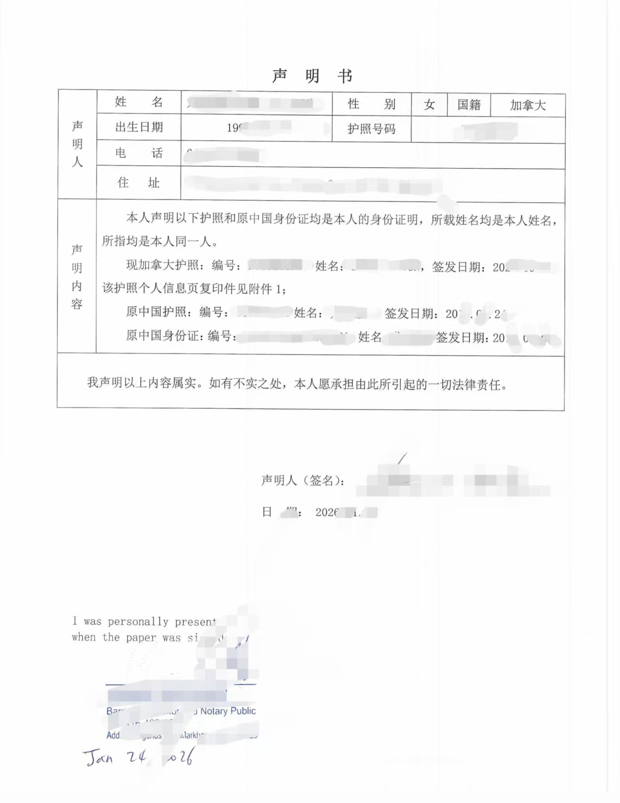 由于当事人身在加拿大,无法回国亲自处理相关文件,遂通过远程方式联系到我们,咨询是否可以在加拿大出具“同一人声明书”,以及该文件是否需要办理海牙认证。