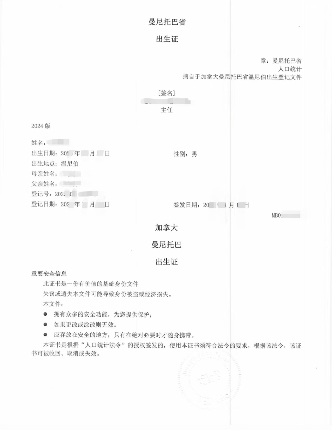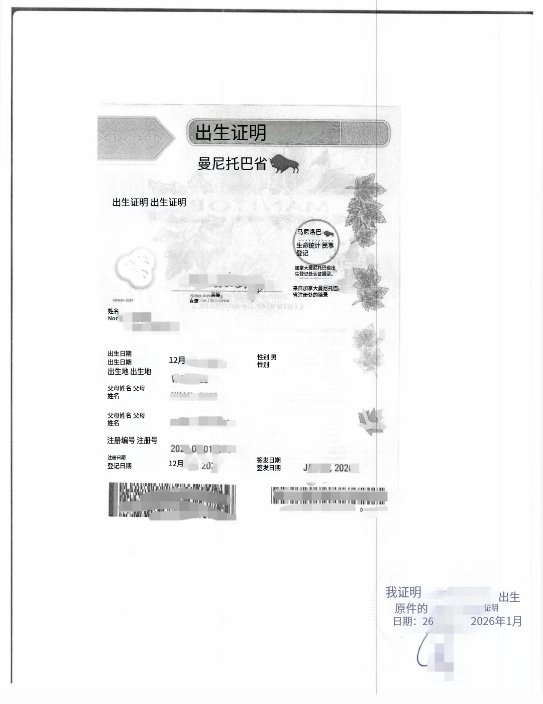 最近刚刚完成一份曼尼托巴省(Manitoba)出生证,当事人常住安省,文件用于回国办理户口、亲属关系、教育或其他国内事务。这里统一说明两个客户最常问、也最容易踩坑的问题。