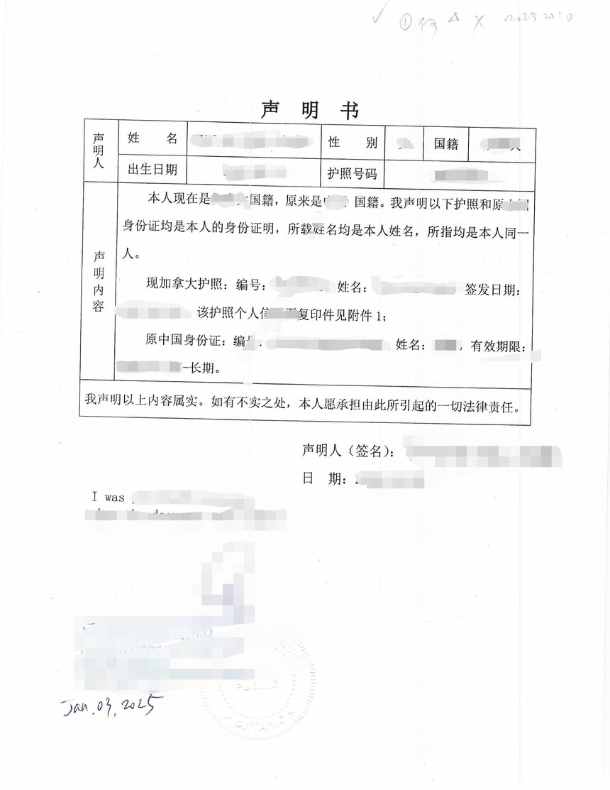 第二步,材料提交与公证,李先生提交过期身份证、加拿大护照原件及复印件,华译网协助起草审核同一人声明书,安排专业公证人完成公证。