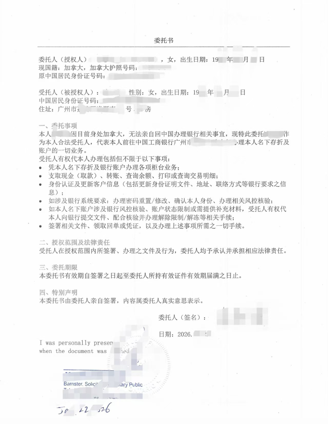 当事人身在BC 省温哥华,文件公证与海牙认证则安排在安省多伦多完成。整个流程通过提前核对银行使用要求、明确委托事项范围后一次性完成,避免因内容不符导致国内银行拒收。