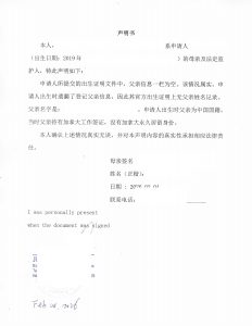 最近一次委托中,客户需要出具父亲在加拿大的身份情况证明,用于为孩子向中国有关部门申请中国旅行证。由于孩子的出生证明中部分信息存在缺失,中国使领馆要求补充说明材料。我们根据实际情况,协助客户准备声明文件并完成公证,确保内容符合领馆审核逻辑,避免反复补件。