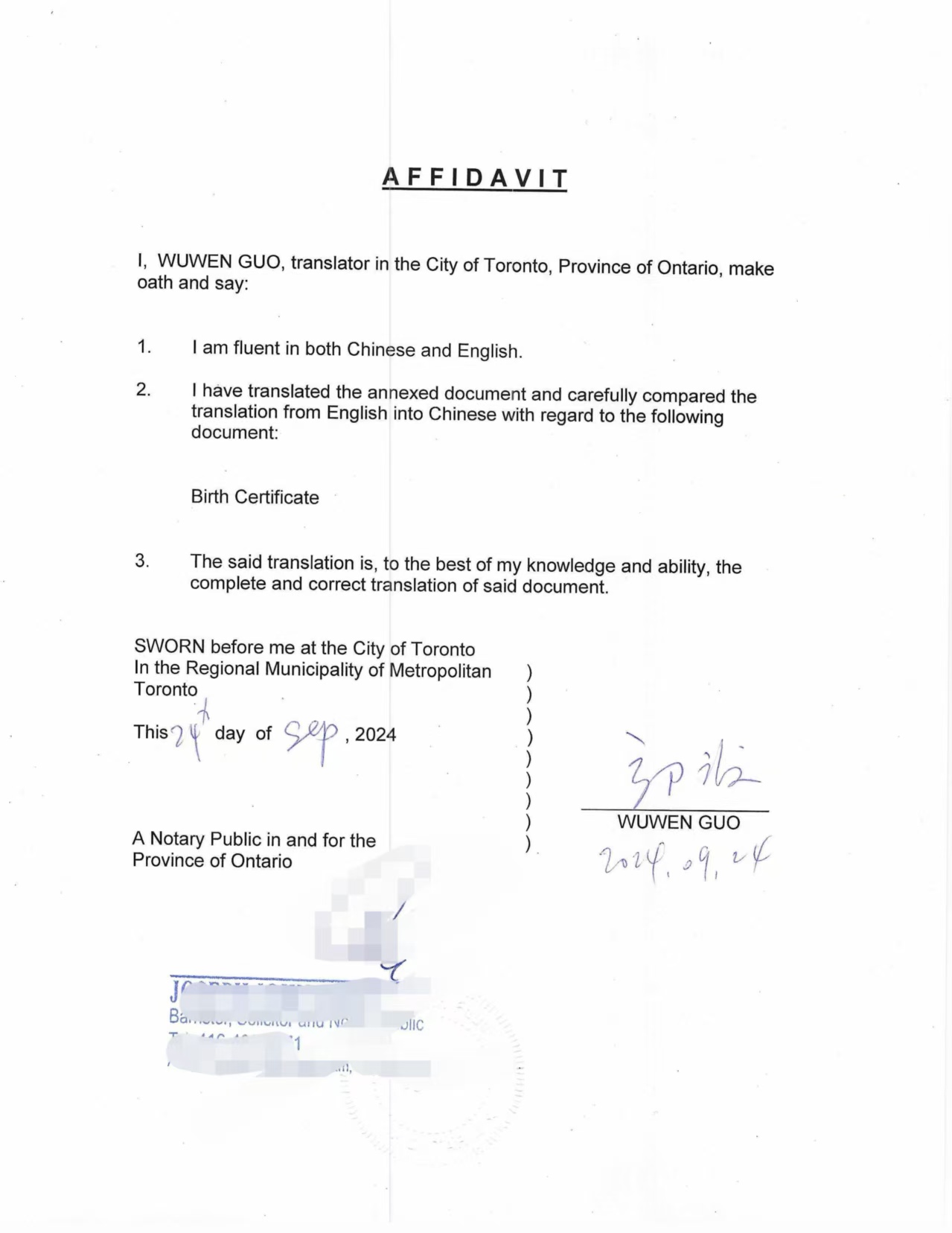 在安省完成翻译、公证