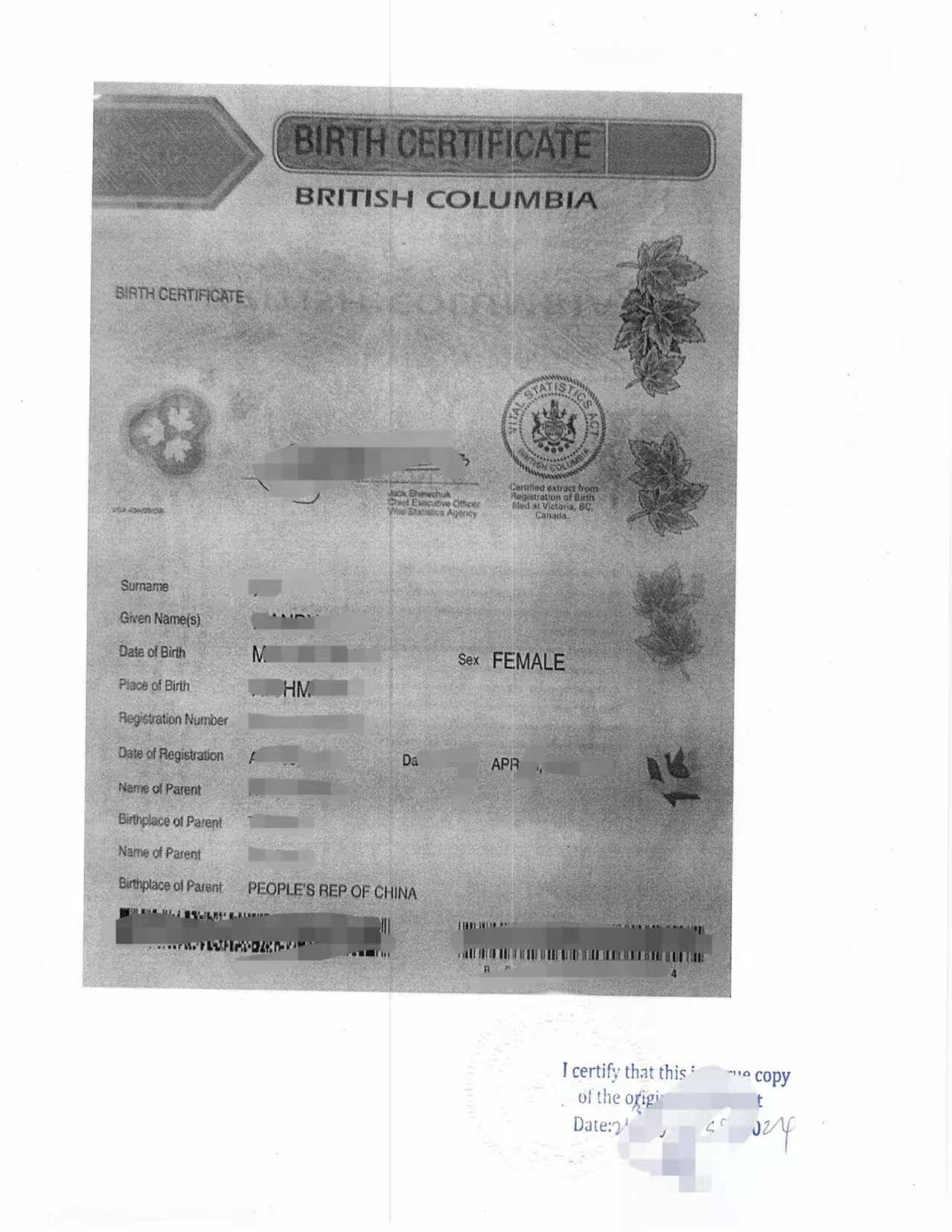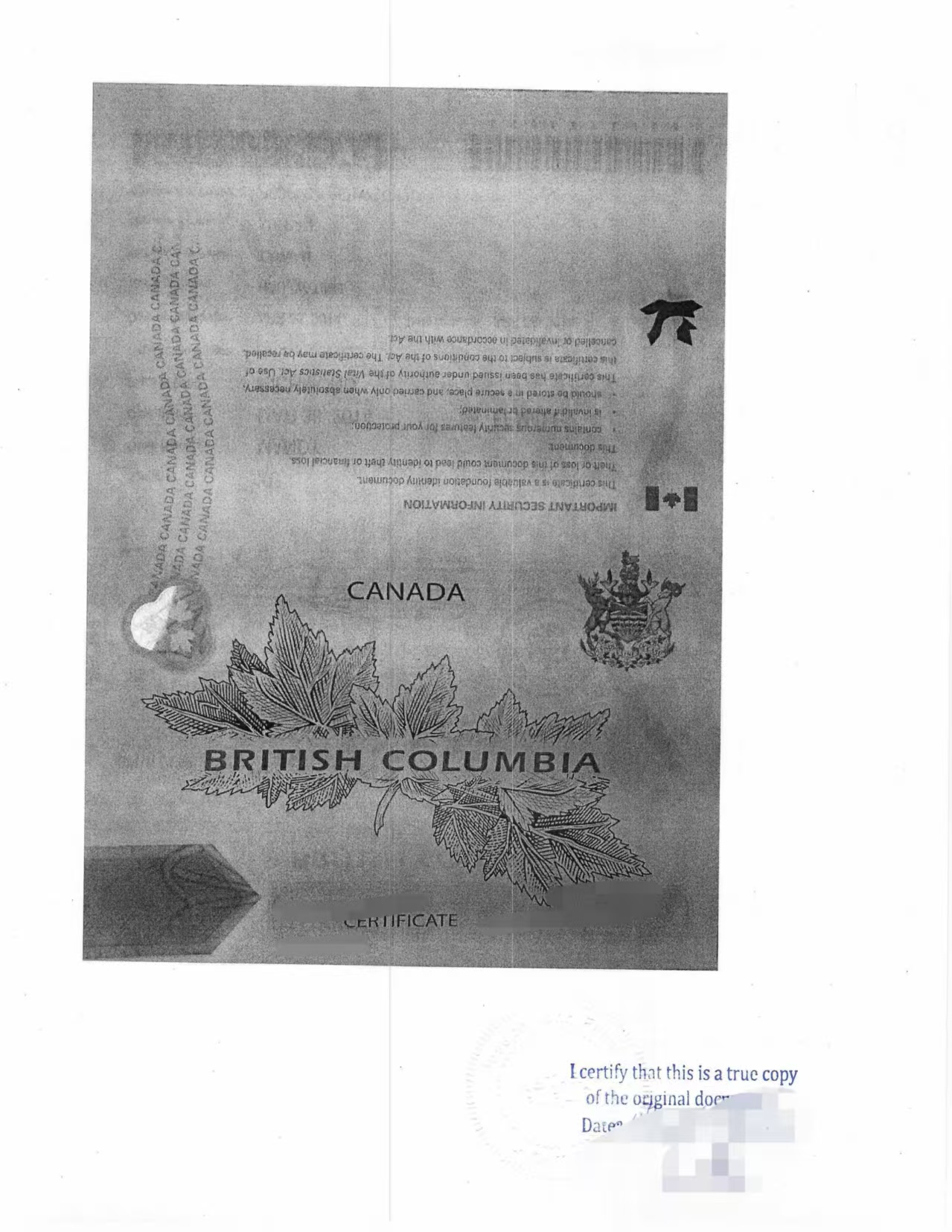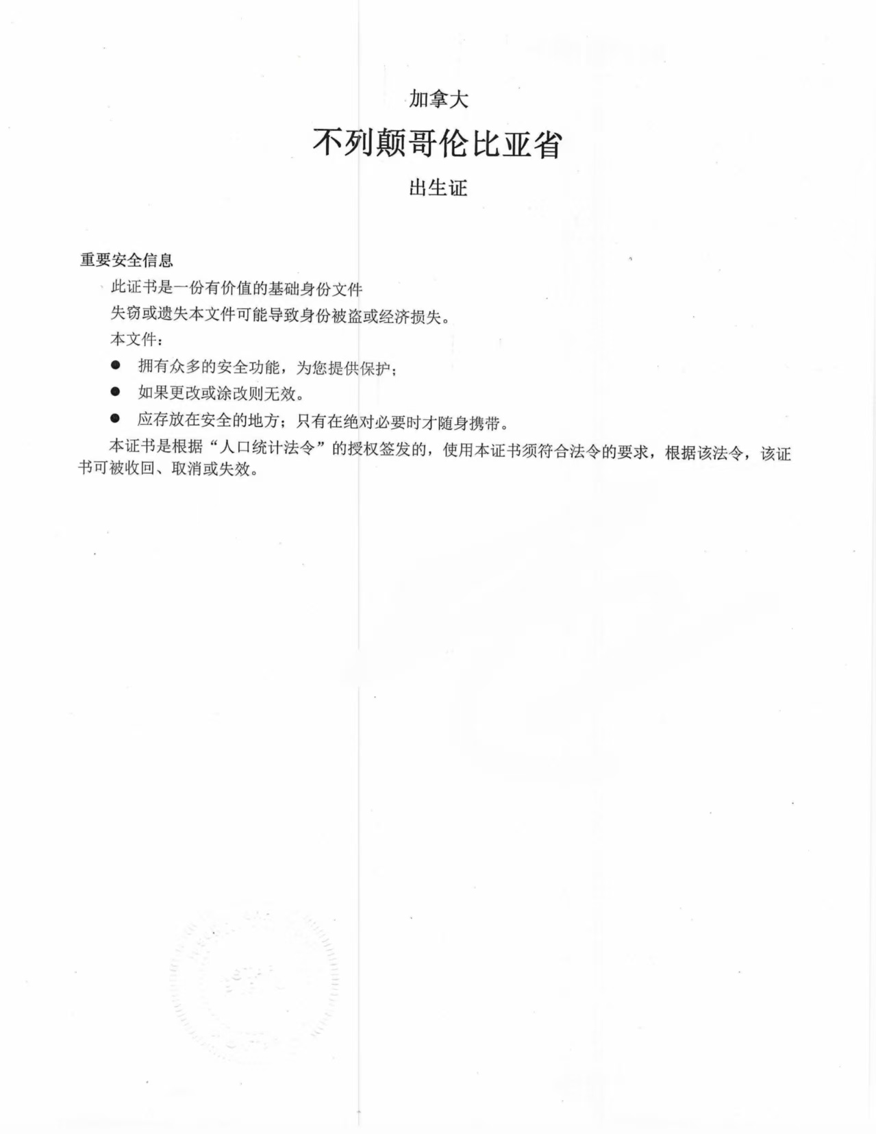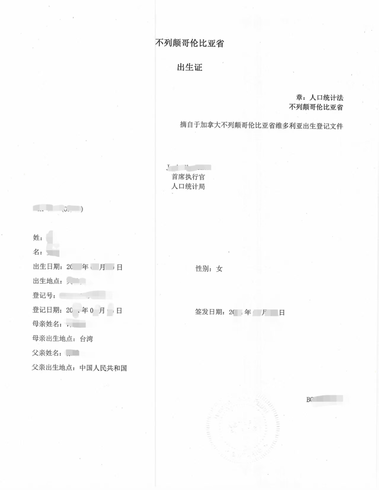 BC省出生证原件