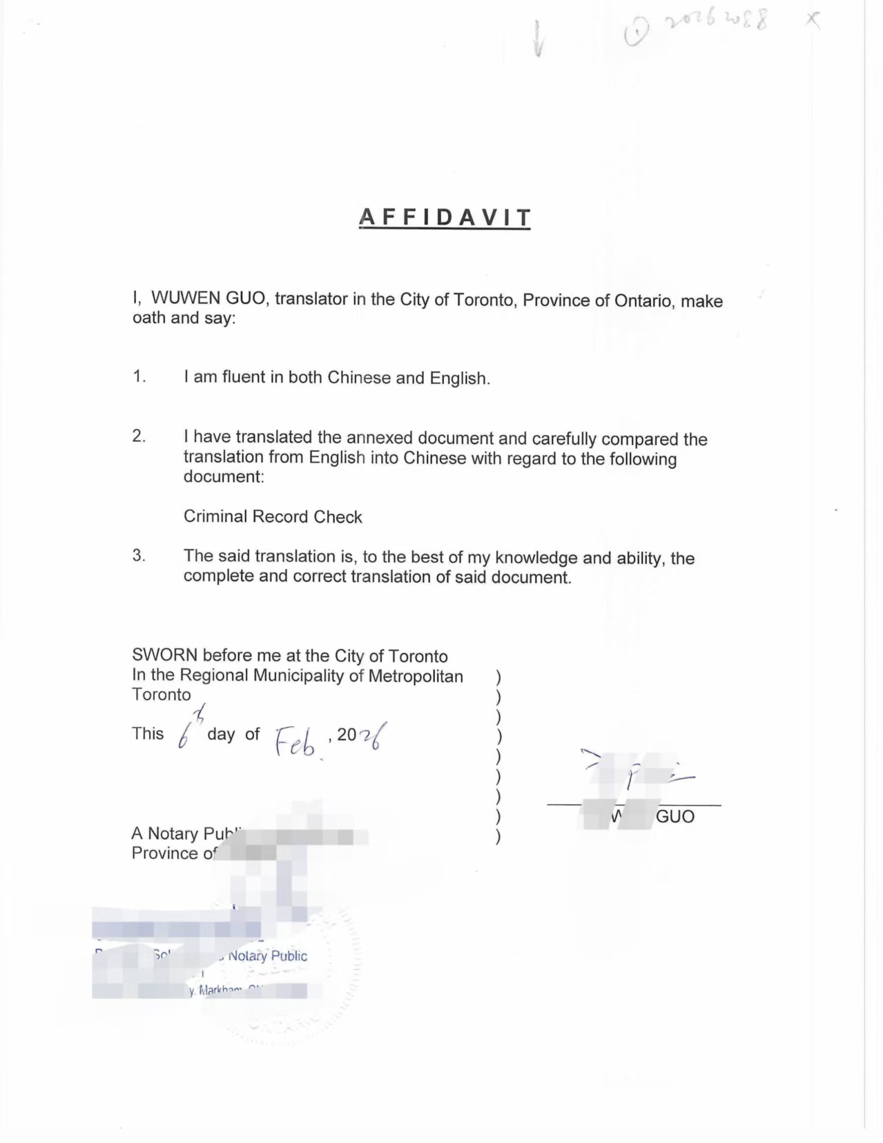 办理过程中,我们首先对无犯罪证明文件进行规范处理。该文件由加拿大警察局正式出具,内容明确显示查询结果为无犯罪记录。我们在此基础上完成中译文本,并由译员出具翻译宣誓文件,确保译文与英文原件内容一致、格式规范,符合国内教育机构的审查习惯。